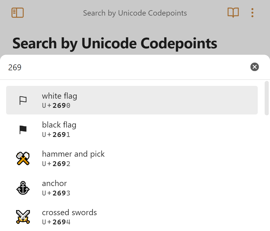 Once the search modal is open, you can find characters by typing your query. This can be a descriptive term like arrow or heart, or a specific codepoint such as 269.