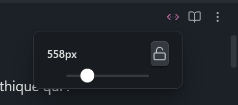 Each Markdown tab has a <-> icon in its top-right header. Click it to open a width slider (300px–1600px). Visual guides appear on both sides of the editor while adjusting.