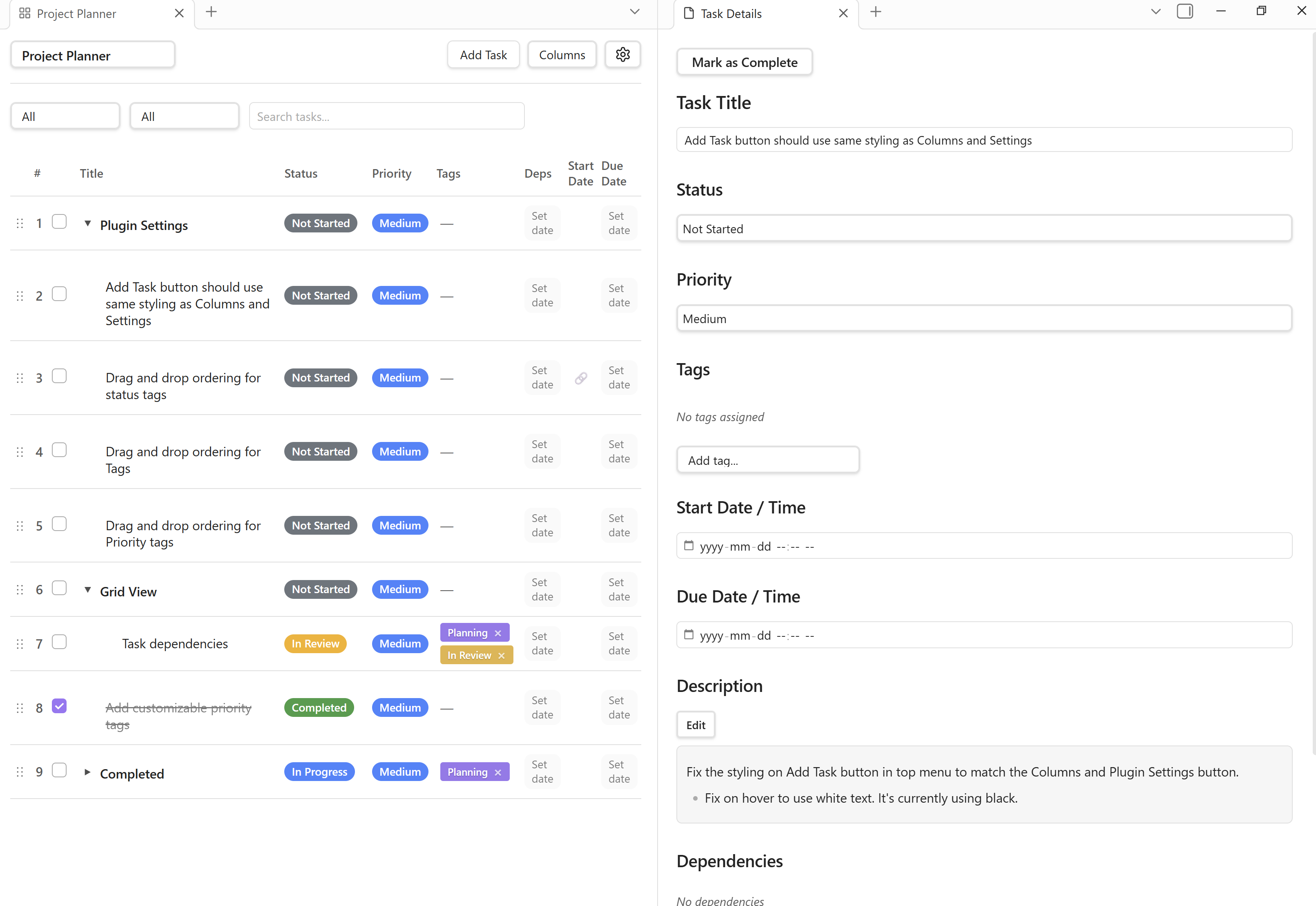 - Task Detail Panel — Full editing of status, priority, dates, tags, links, description, subtask checklist, effort, cost, and dependencies