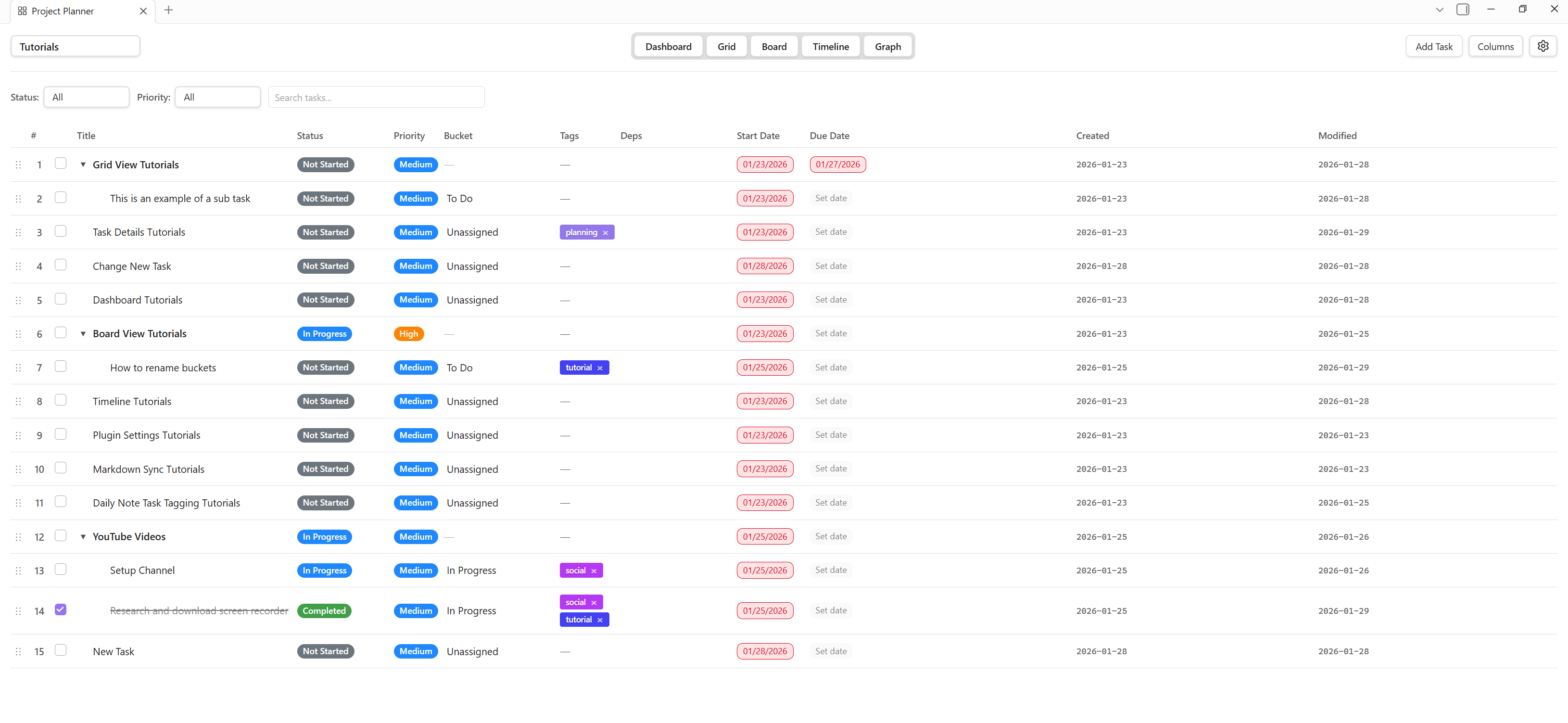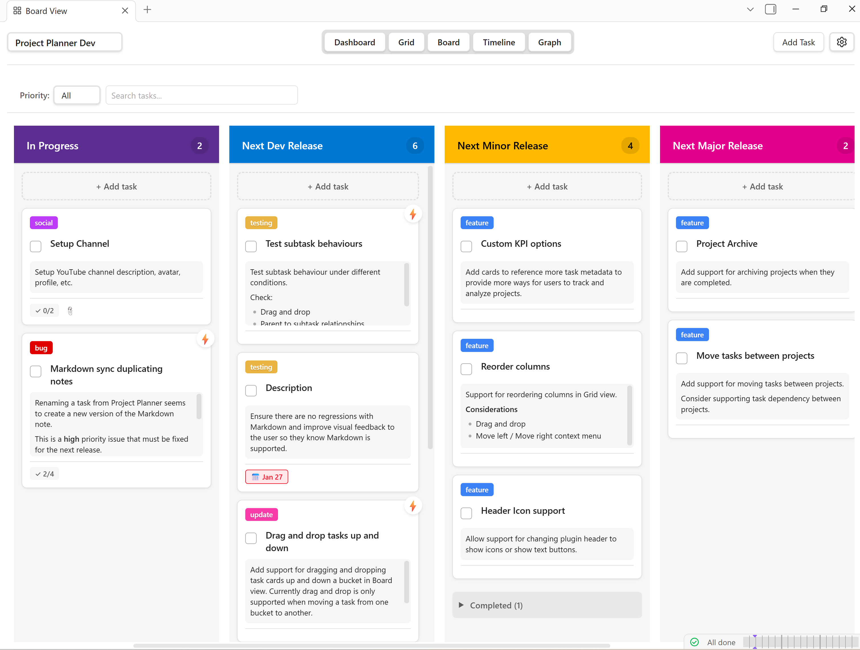 A Microsoft Planner–style project management plugin for Obsidian with grid, board, and timeline views.