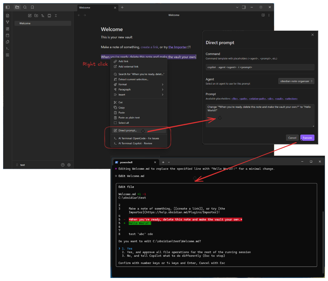 Launch external terminal sessions with AI agents (GitHub Copilot CLI or OpenCode) directly from Obsidian. Execute custom commands with context-aware placeholders from the command palette or context menus.