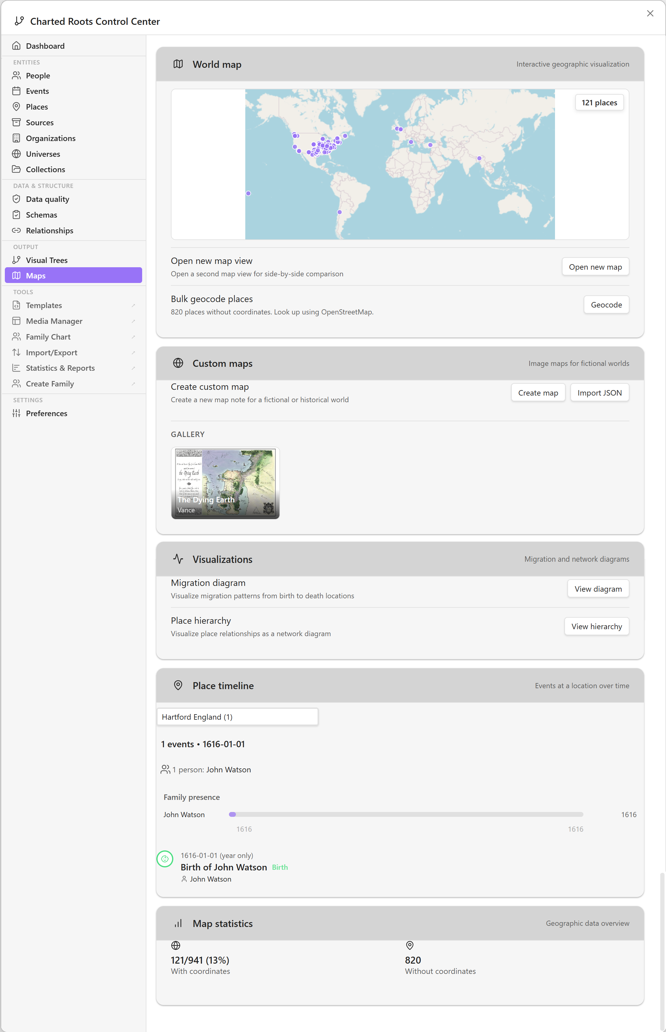 - Map view: Visualize birth/death locations geographically