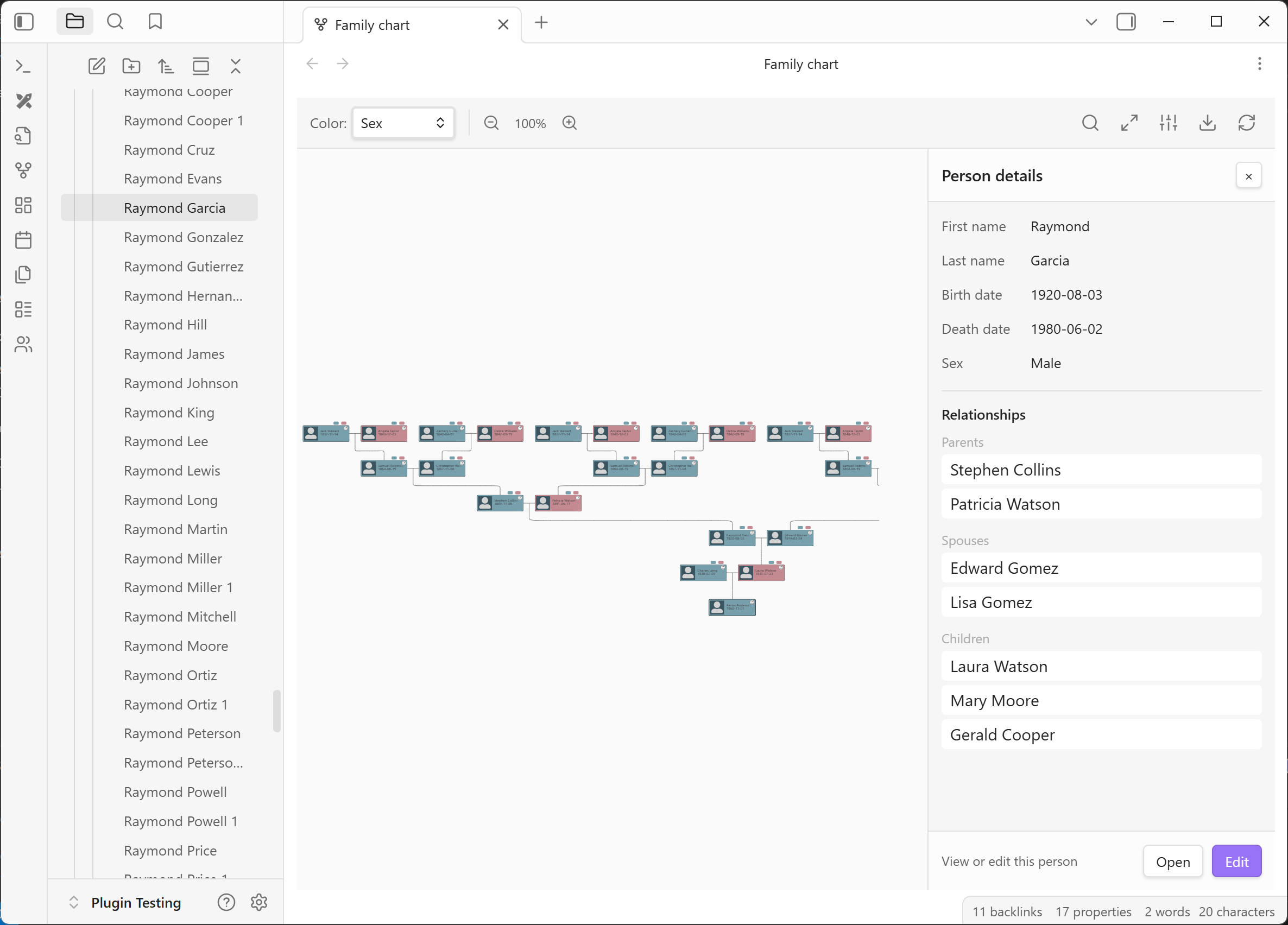 Charted Roots brings professional genealogical tools to Obsidian. Import, organize, visualize, and share family histories and fictional worlds without leaving your vault. From GEDCOM imports to PDF reports, interactive charts to map views, manage your research with the power of linked Markdown notes. Built for genealogists, historians, writers, and worldbuilders.
