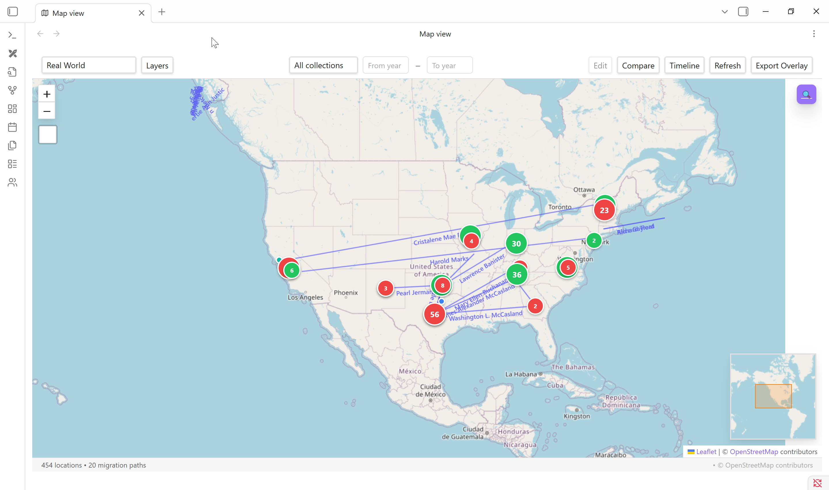 - Interactive map view with marker clustering, migration paths, heat maps, time slider animation, journey mode, and geocoding lookup