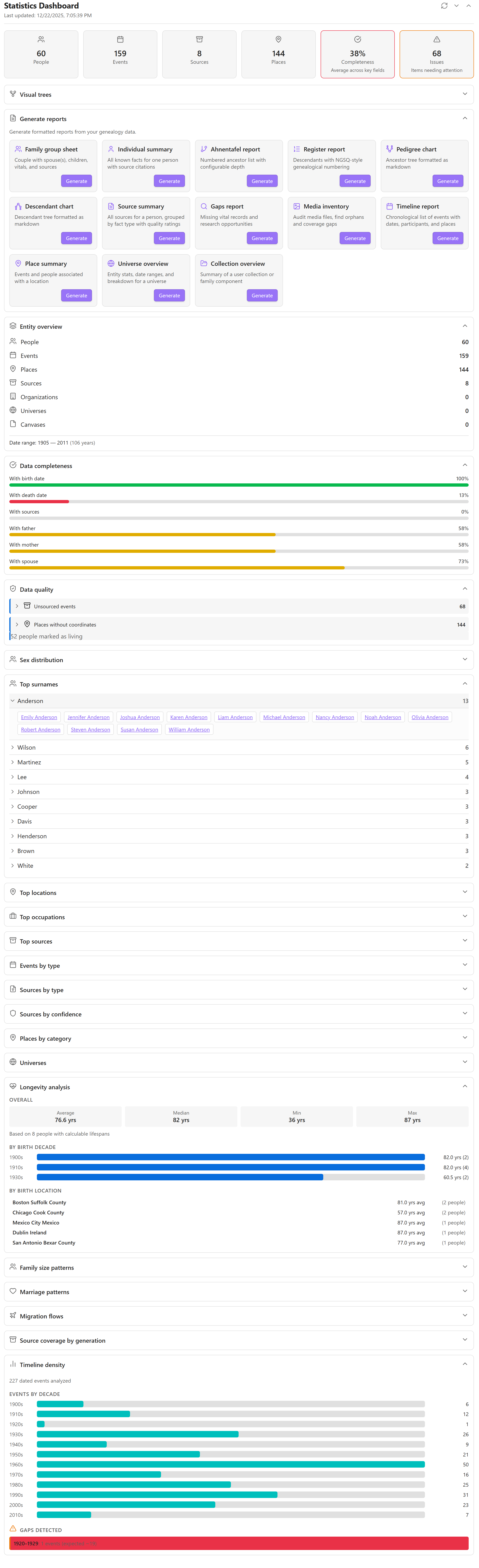- Statistics dashboard with record superlatives, longevity analysis, family size patterns, migration flows, and data quality alerts