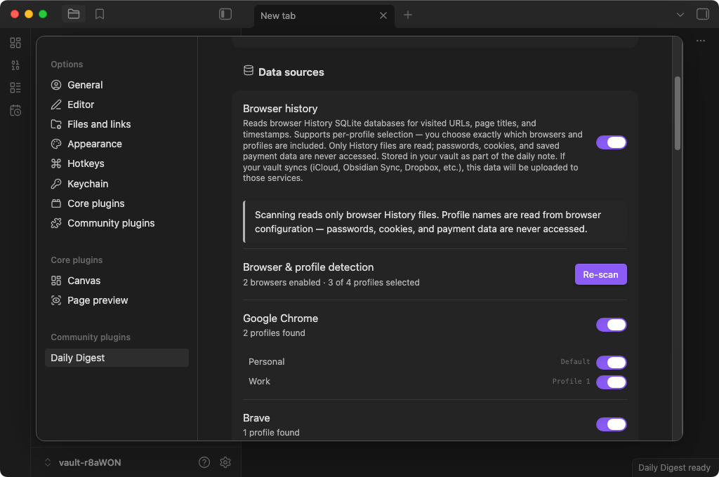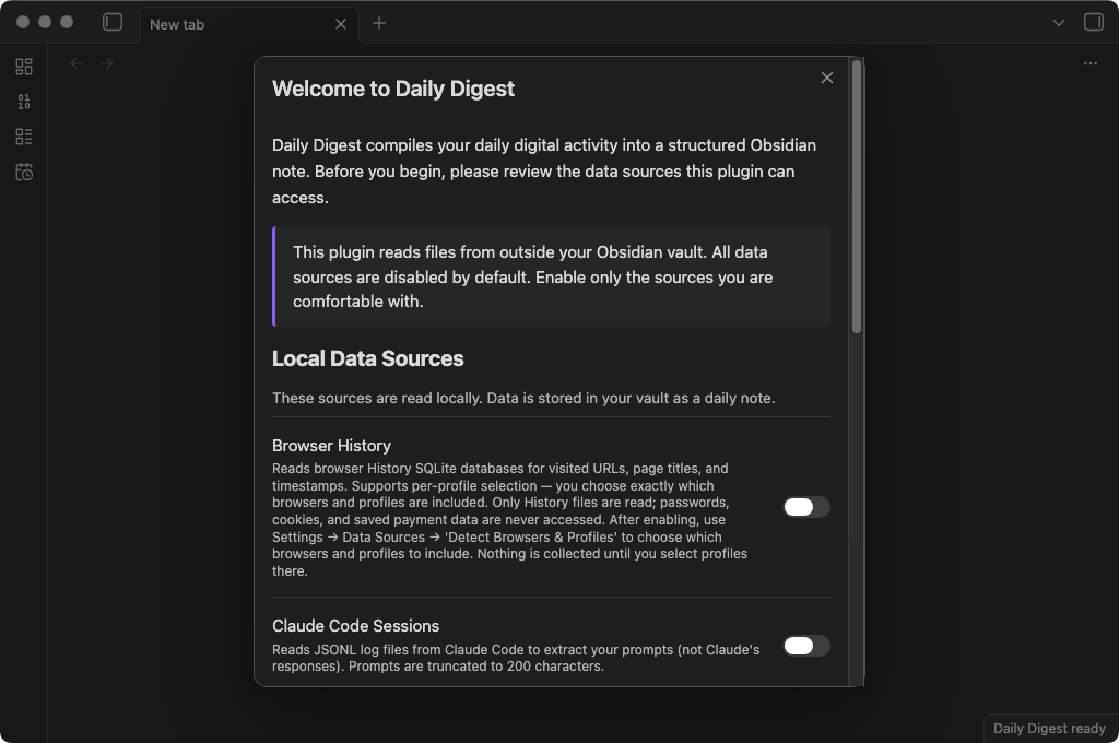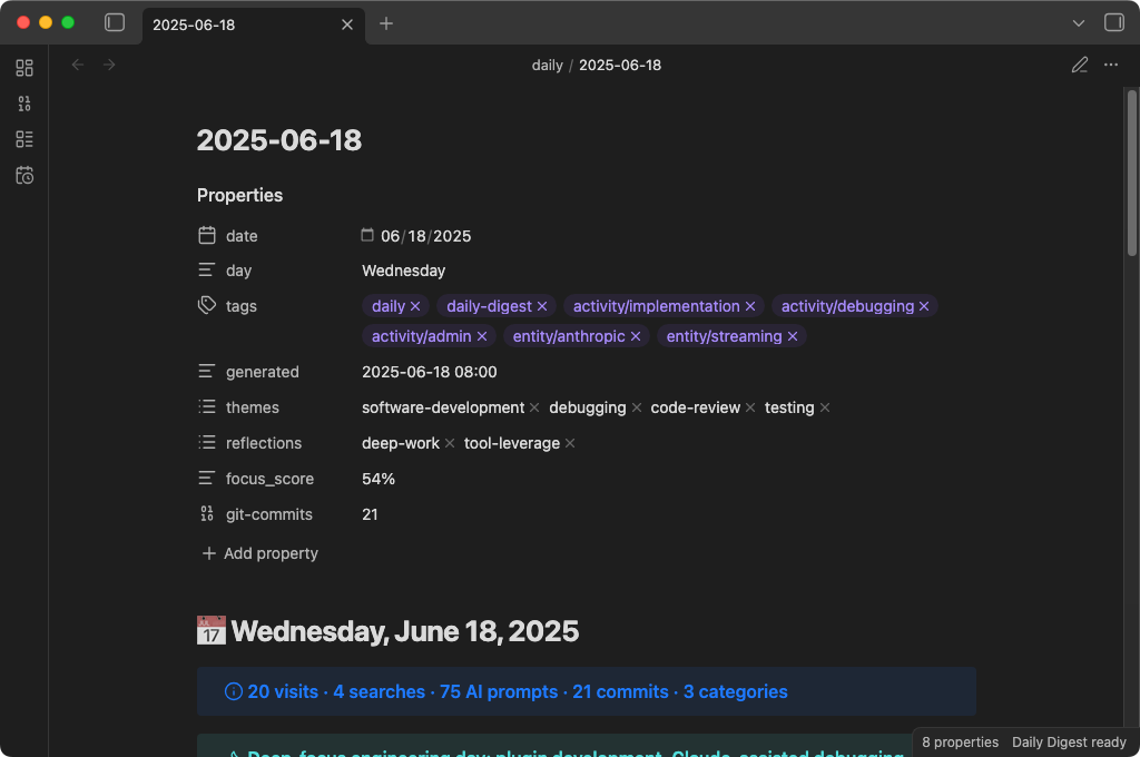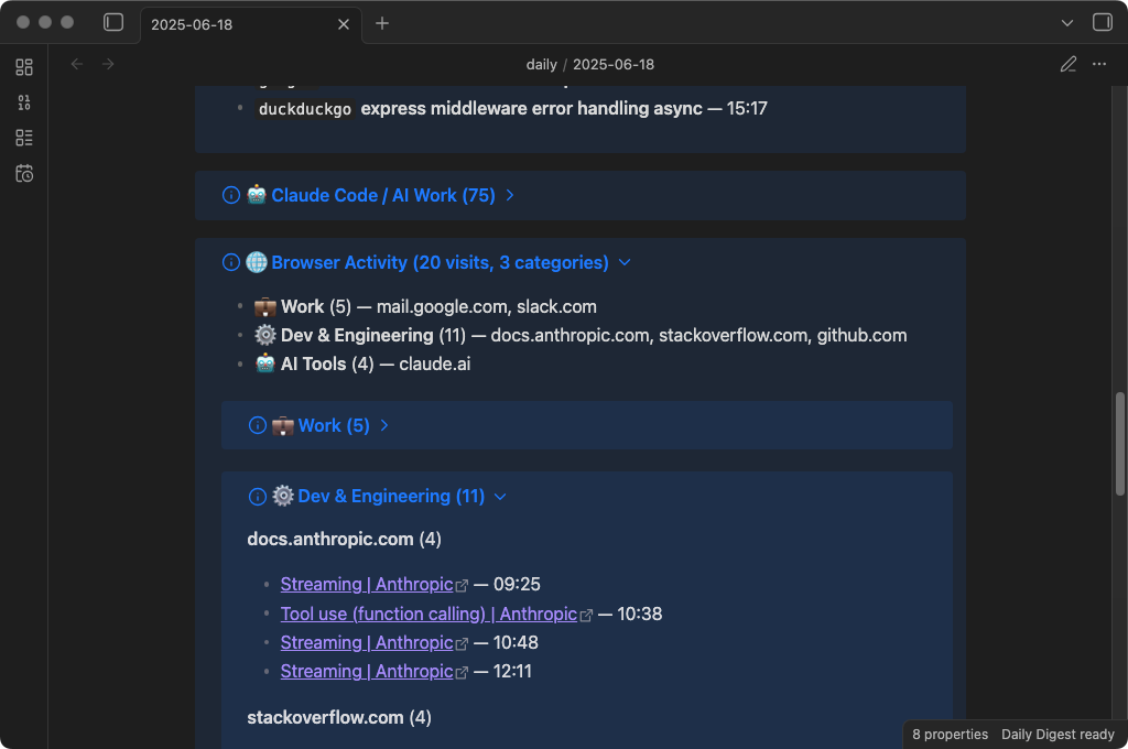 Your day, distilled. Daily Digest is an Obsidian plugin that reads your browser history, search queries, Claude Code sessions, Codex CLI sessions, and git commits, then compiles them into an AI-summarized daily note.