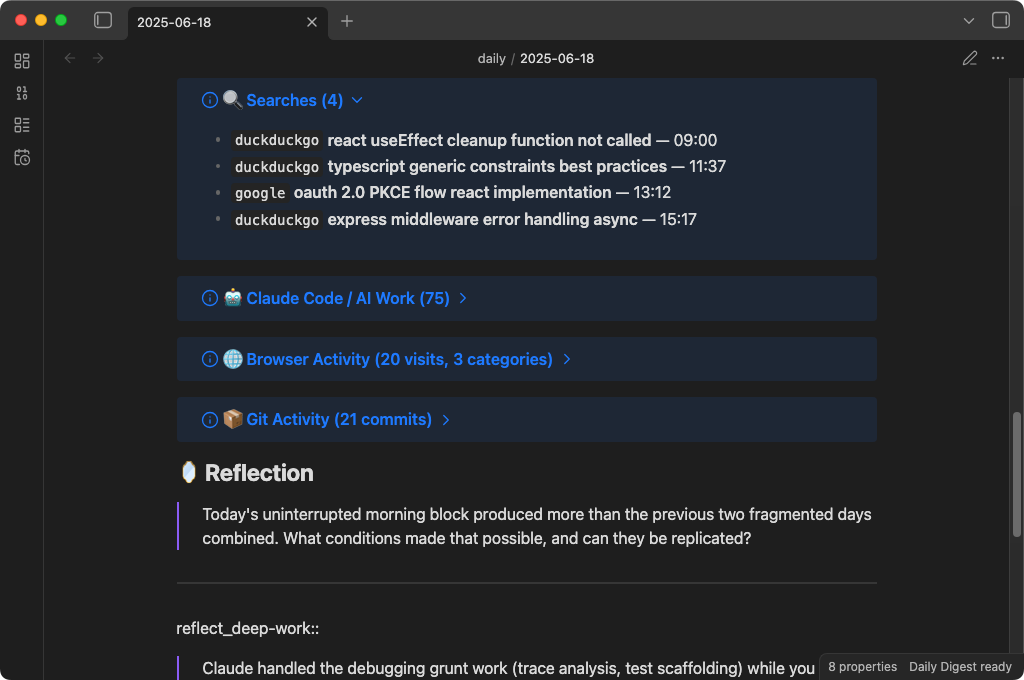 Does this work without AI? Yes. The "Generate today's daily note (no AI)" command gives you a fully structured activity log with categorized browser visits, searches, and Claude Code sessions — just no headline, summary, or reflection questions.