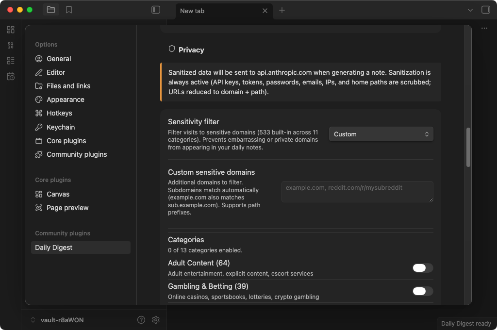 For domains you'd rather not see in your daily notes at all, the built-in sensitivity filter covers 419 domains across 11 categories:
