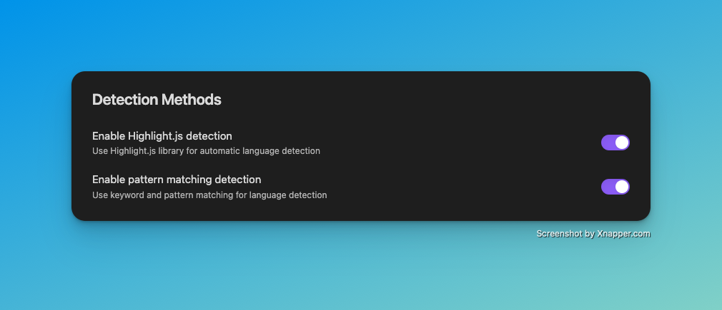Enable Highlight.js detection: Uses the proven Highlight.js library for automatic language detection. Very precise for common programming languages.