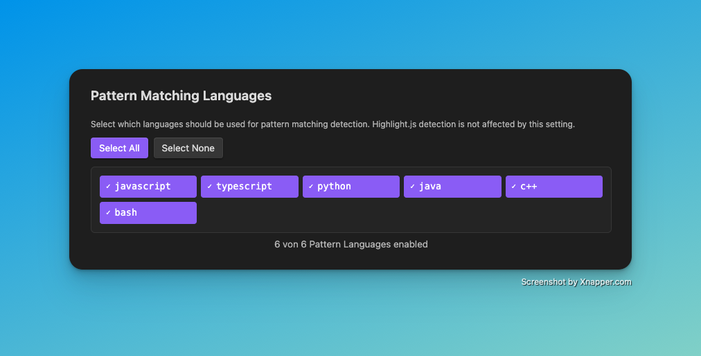 Select specific languages for Pattern Matching. Highlight.js detection is not affected by this setting.