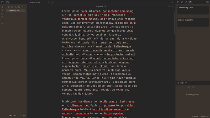 I was writing a book the other day within obsidian, and randomly thought it would be good if I could make a comment about a specific bit, so I randomly searched for plugins that existed, and saw that they either weren't implemented as I wanted, or stored the comments in the same file as the note which wouldn't work in my scenario. So as any normal person would do I just decided to make my own from scratch in a programming language that I did not know.