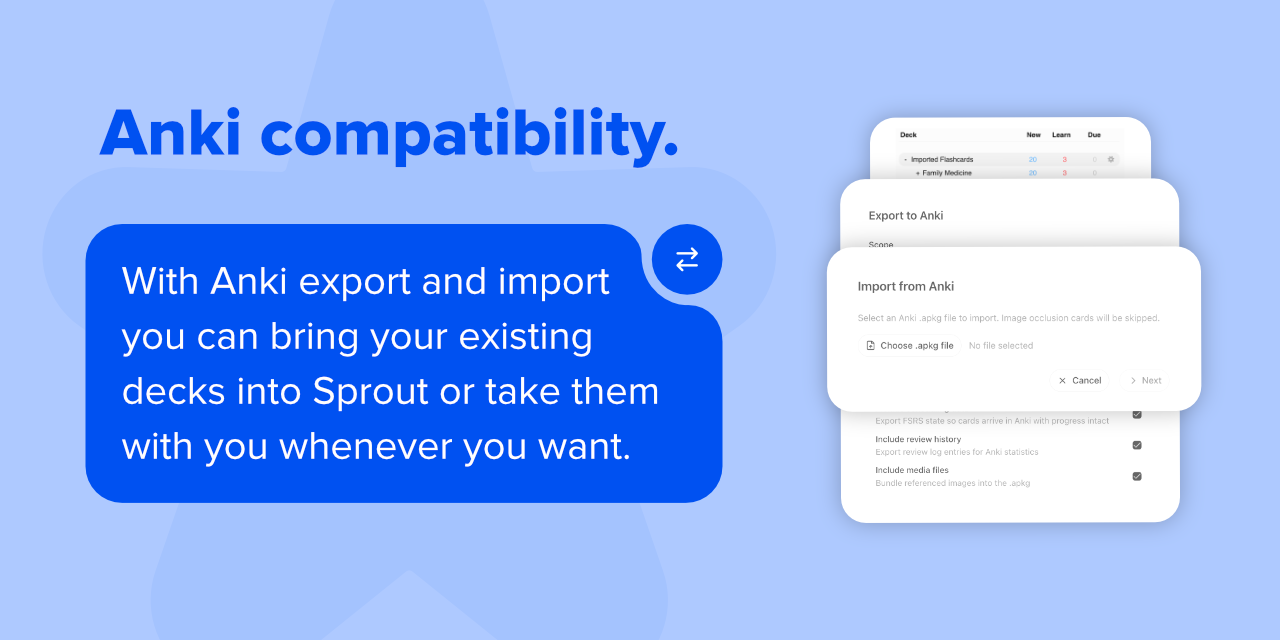 - Does it work with Anki? Yes. LearnKit supports Anki import and export for decks, media, and scheduling-related data where supported. Image Occlusion flashcards are currently skipped on import and are not exported.