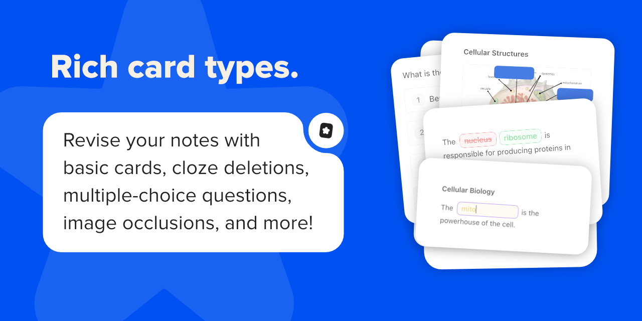 - Rich flashcard types — cloze, basic, reversed, multiple choice, image occlusion, and more.