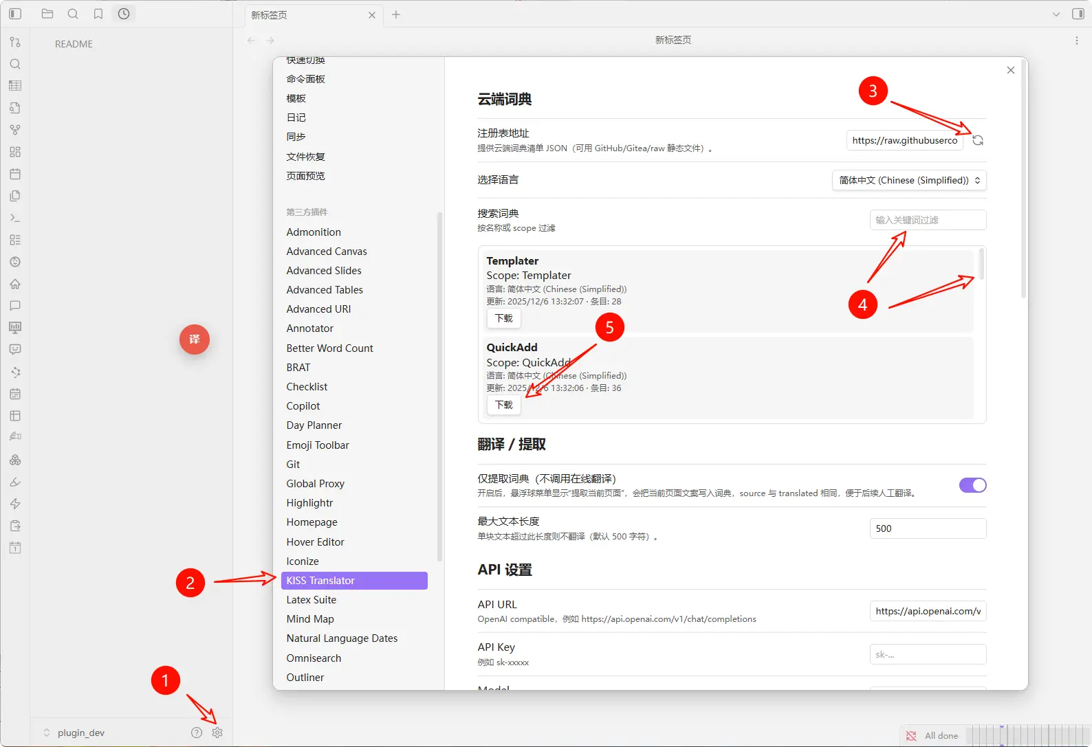 打开设置中的 仅提取词典 即可不调用 AI 翻译,只将原文写入词典。用户可以通过这个办法快速批量获取插件的原文。