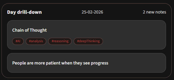 - Yearly and all-time: click a week or month to inspect grouped notes