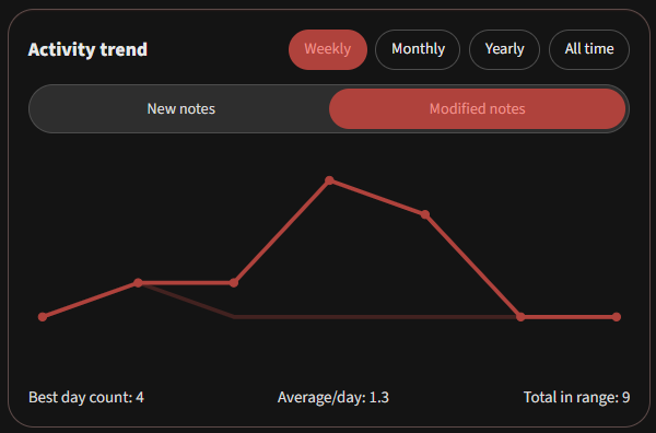 [!NOTE] If you follow Zettelkasten, it is easy to over-indulge on collecting fleeting notes and under-invest in linking and refining existing ideas. Vault Activity helps you keep both sides in balance so your system keeps compounding.