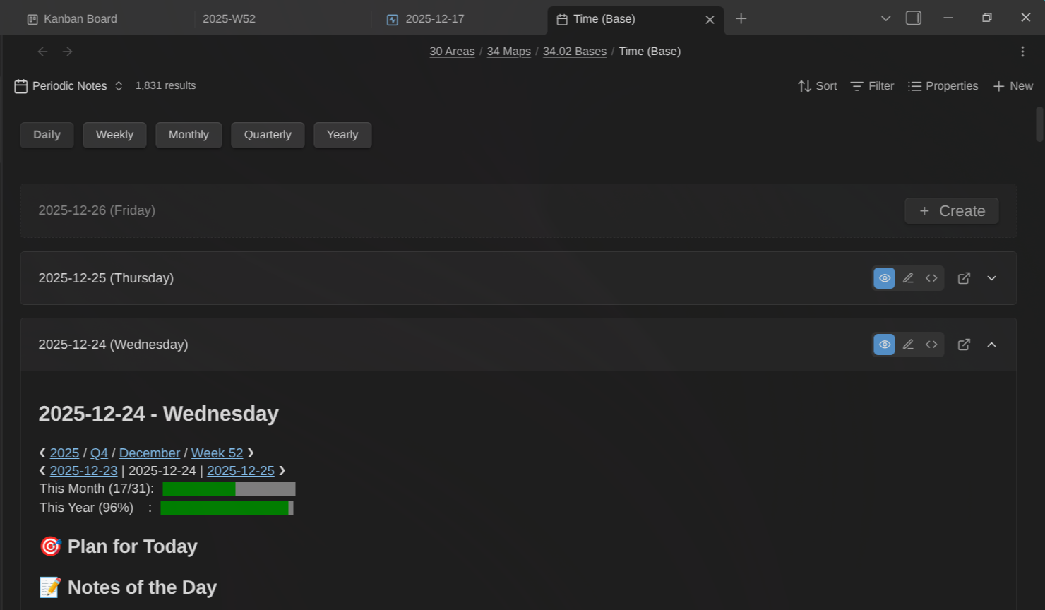 Navigate and manage your journal and periodic reviews with purpose-built Base views. This Obsidian plugin adds two custom view types for daily, weekly, monthly, quarterly, and yearly notes.
