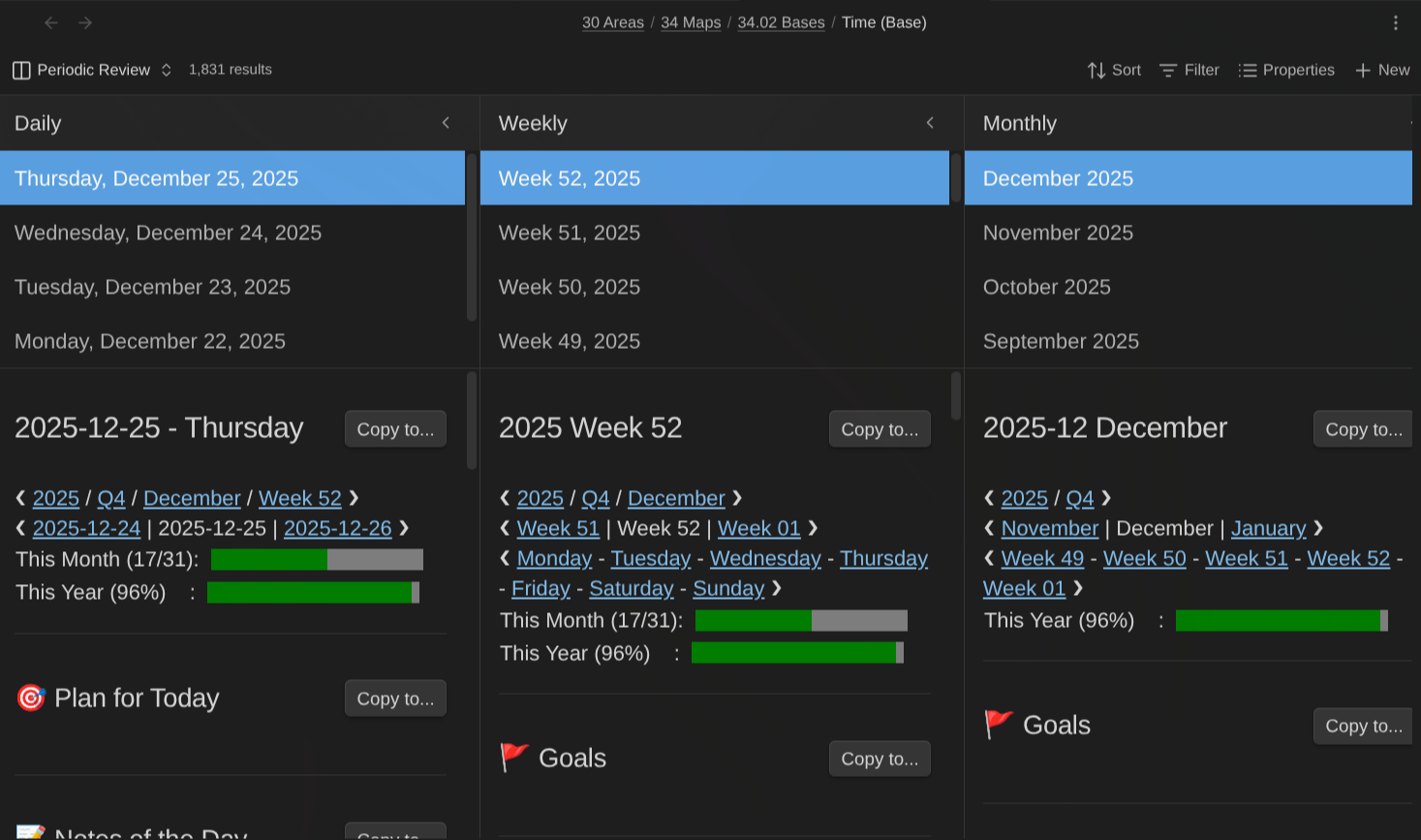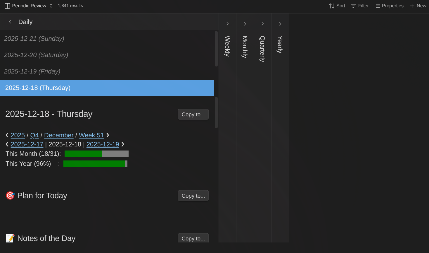 The Periodic Review view has a different goal: serve during periodic reviews (weekly, monthly, quarterly, and yearly reviews) and make it a breeze to integrate information from daily notes into weekly notes, weekly into monthly, monthly into quarterly, and quarterly into yearly.