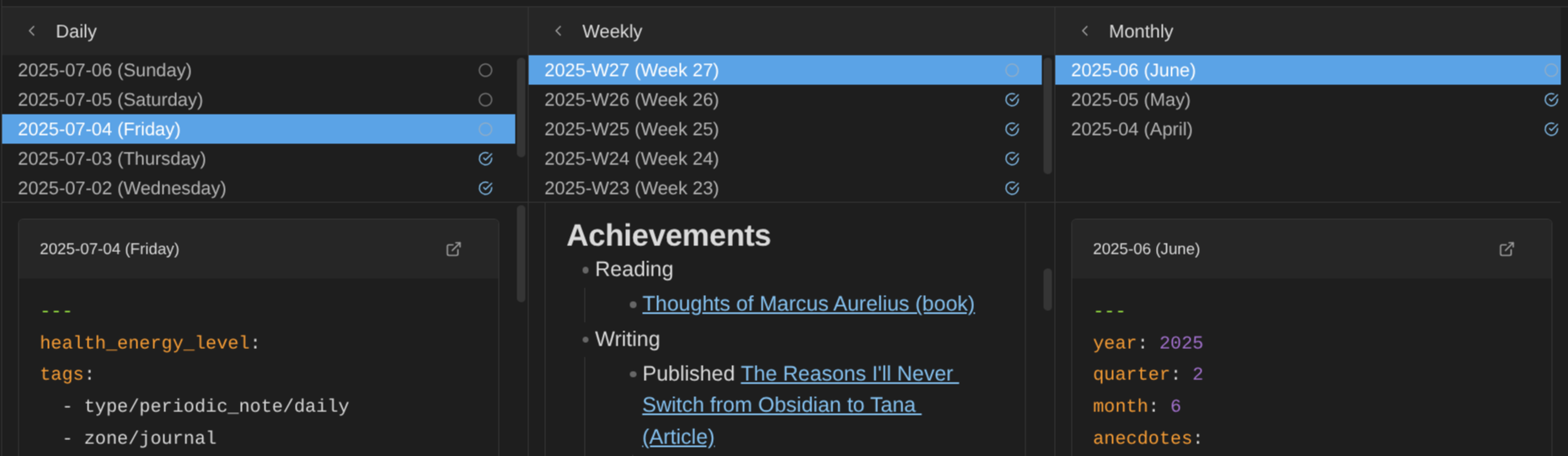 This makes it effortless to review your daily notes, extract the key insights, and write them into your weekly summary. Then review your weekly summaries and extract insights into your monthly note. And so on up the hierarchy.