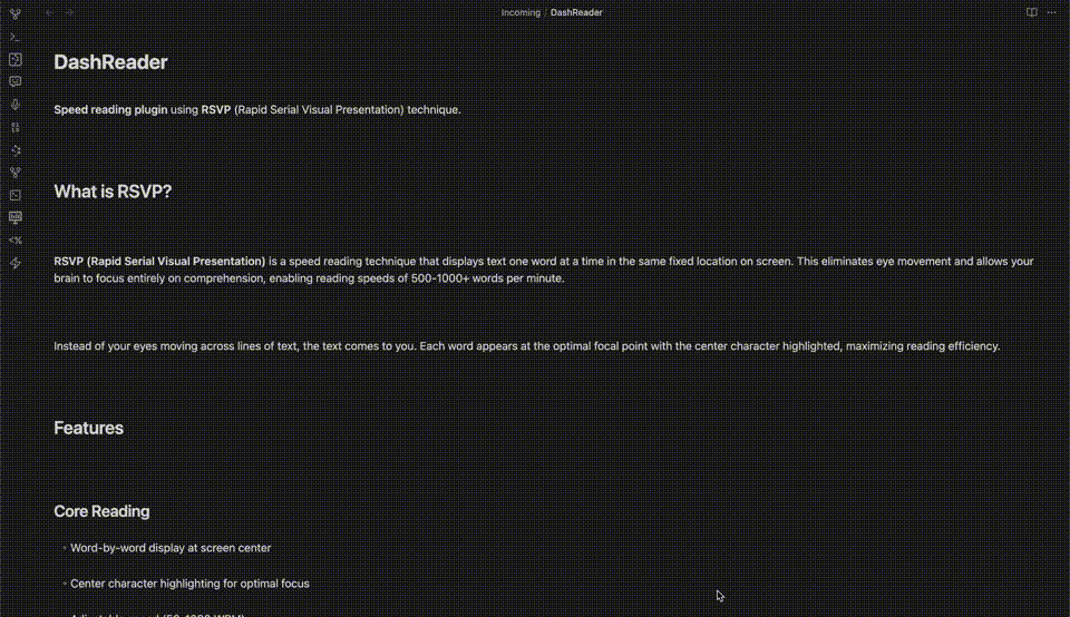 Speed reading plugin for Obsidian using RSVP (Rapid Serial Visual Presentation) technique.