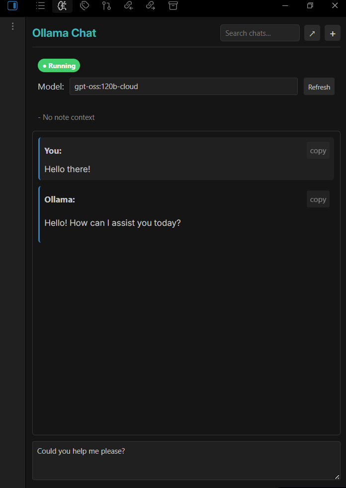 A side panel chat interface for Ollama in Obsidian. Chat with local LLMs directly in your vault.
