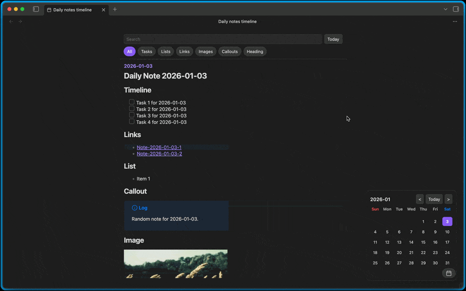 Timeline view for Obsidian daily notes, focused on browsing and review.