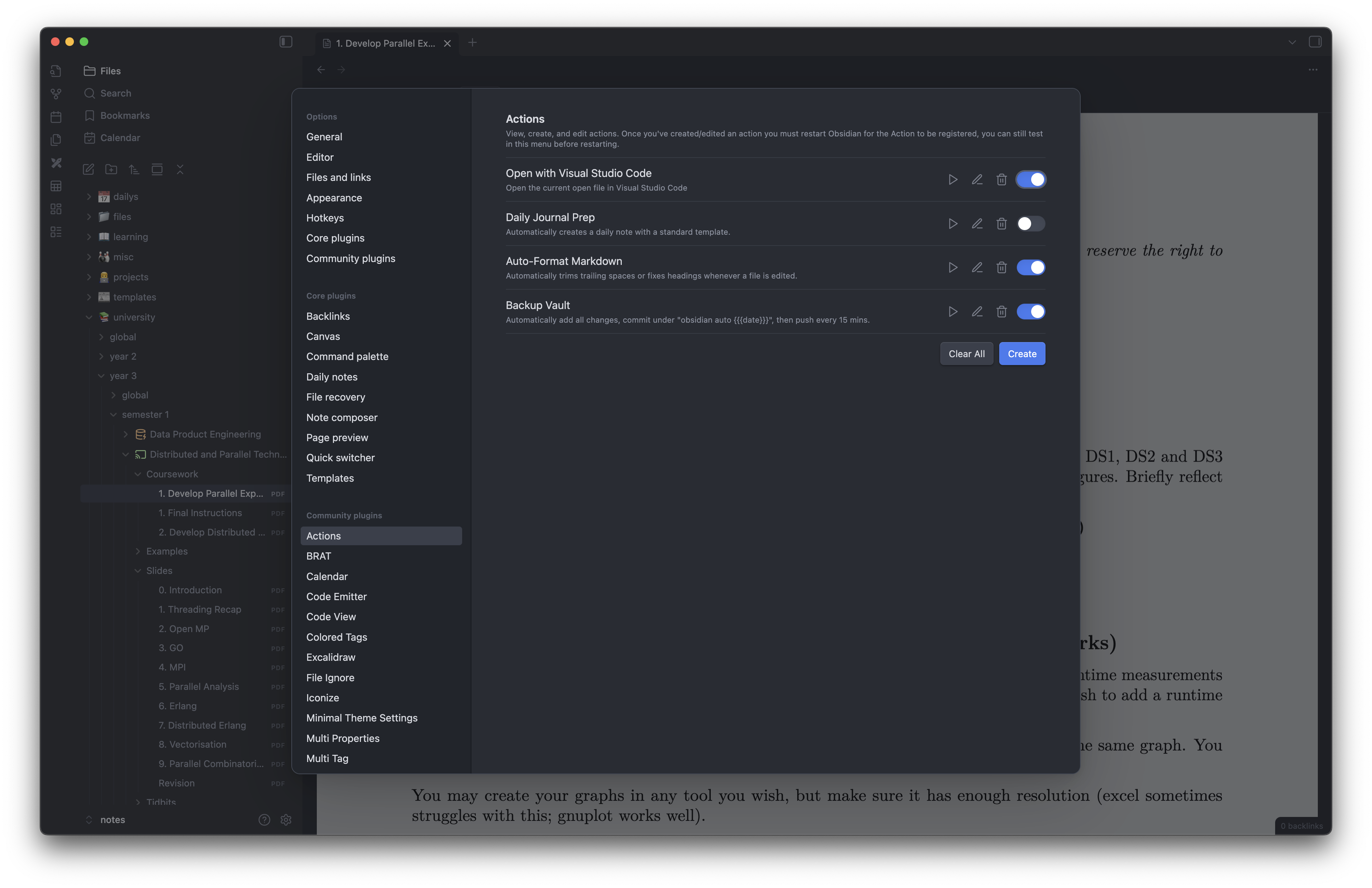 Create and manage custom `shell` or `js` actions that can run on either a schedule, via command palette, or in response to file events.
