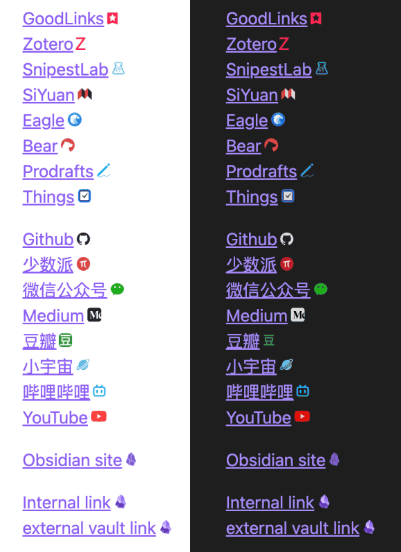 There are two different Obsidian icons to help users better distinguish between Obsidian web links and note links.
