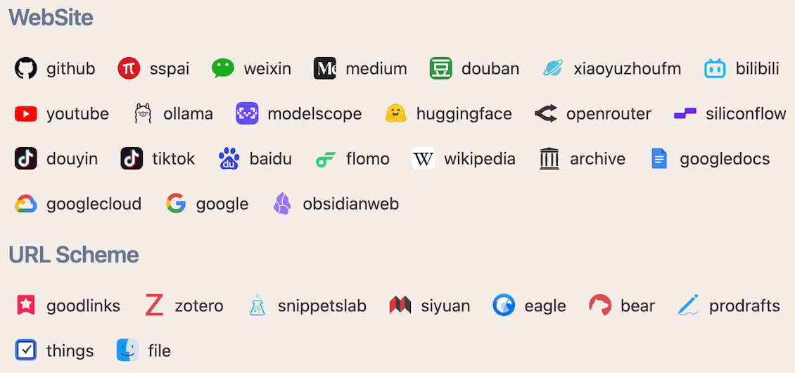 By default, both URL Scheme and WebSite icon are enabled. You could disable any of them via the Style Setting plugin.