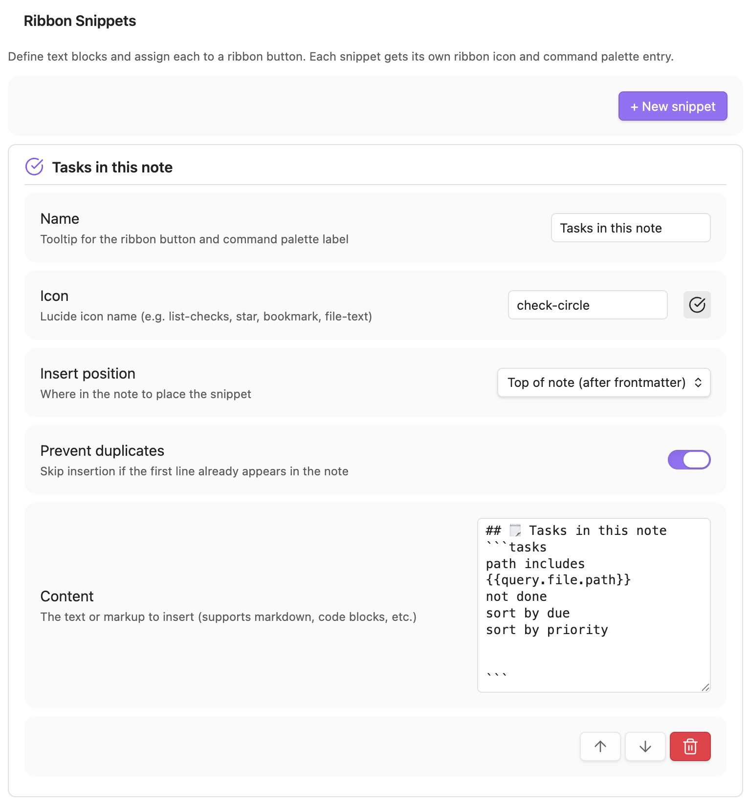 Insert: <name>) - Reorder and manage — move snippets up/down or delete them from settings