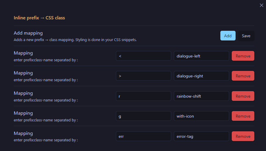 Now once you type `<:Some text here` it would automatically use the corresponding css class from your css snippets