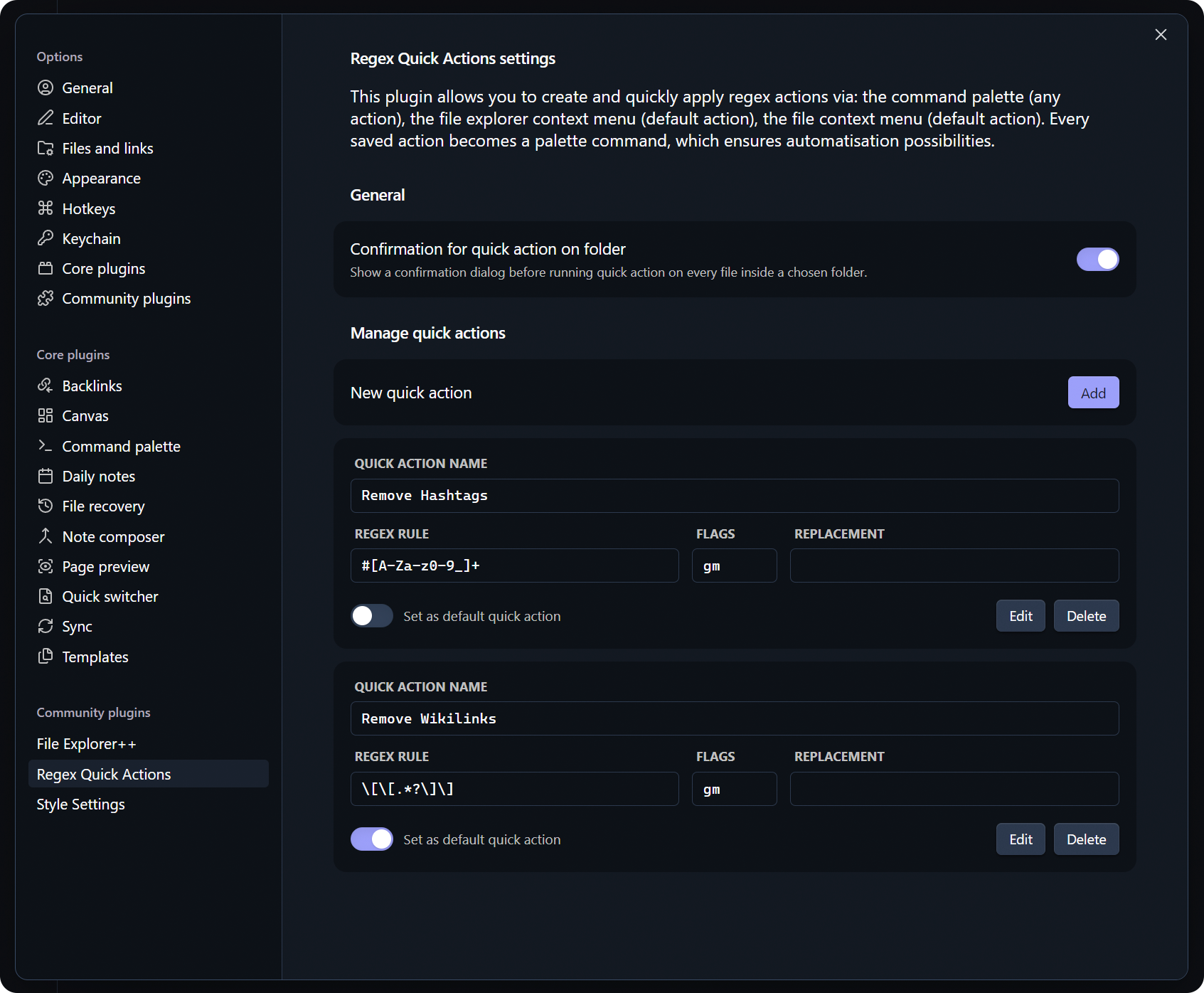 This plugin allows you to create regex actions and quickly apply them in different contexts in Obsidian. The plugin was created for automation purposes, so it is compatible with such plugins, as Commander.