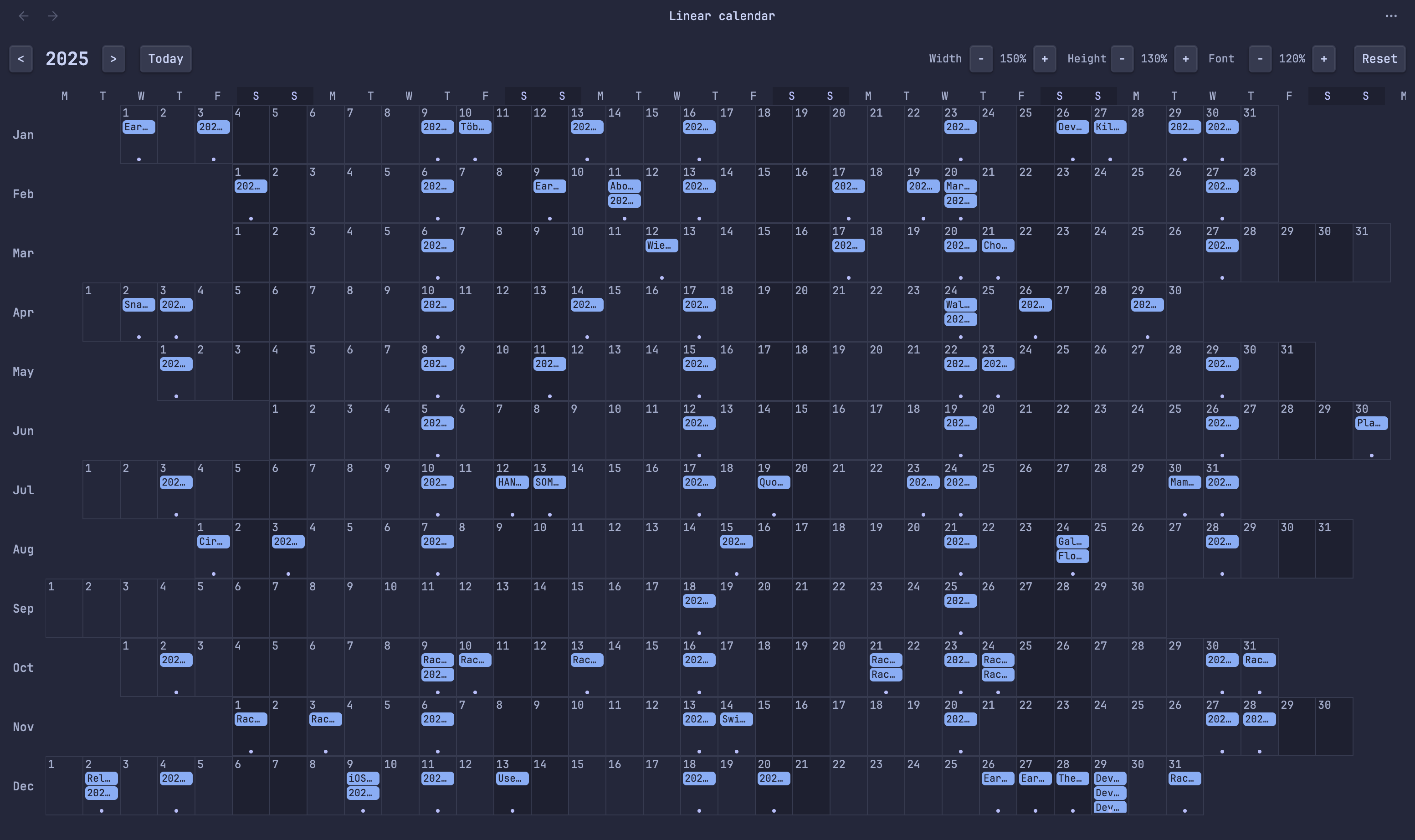- Linear year view - All 12 months displayed as horizontal rows