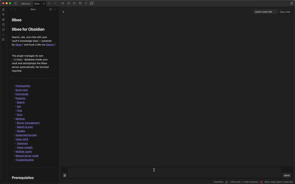 On first launch, the plugin downloads the lilbee server and runs it in the background. When you sync your vault or attach files in the chat, this server breaks your documents into passages and uses Ollama to create searchable embeddings. When you ask a question, it finds the most relevant passages and sends them to the chat model, which writes an answer grounded in your actual documents — with links back to the sources.