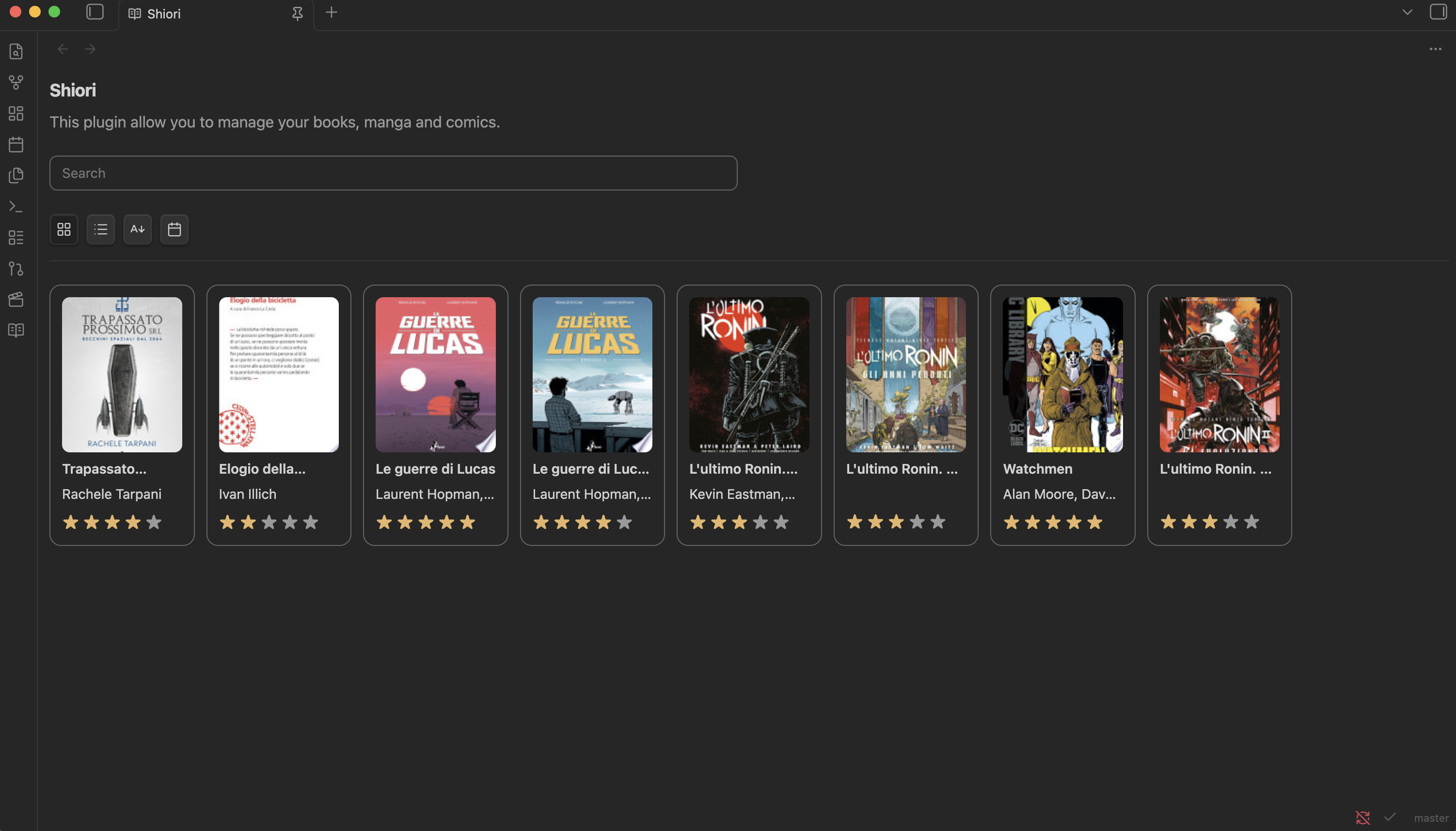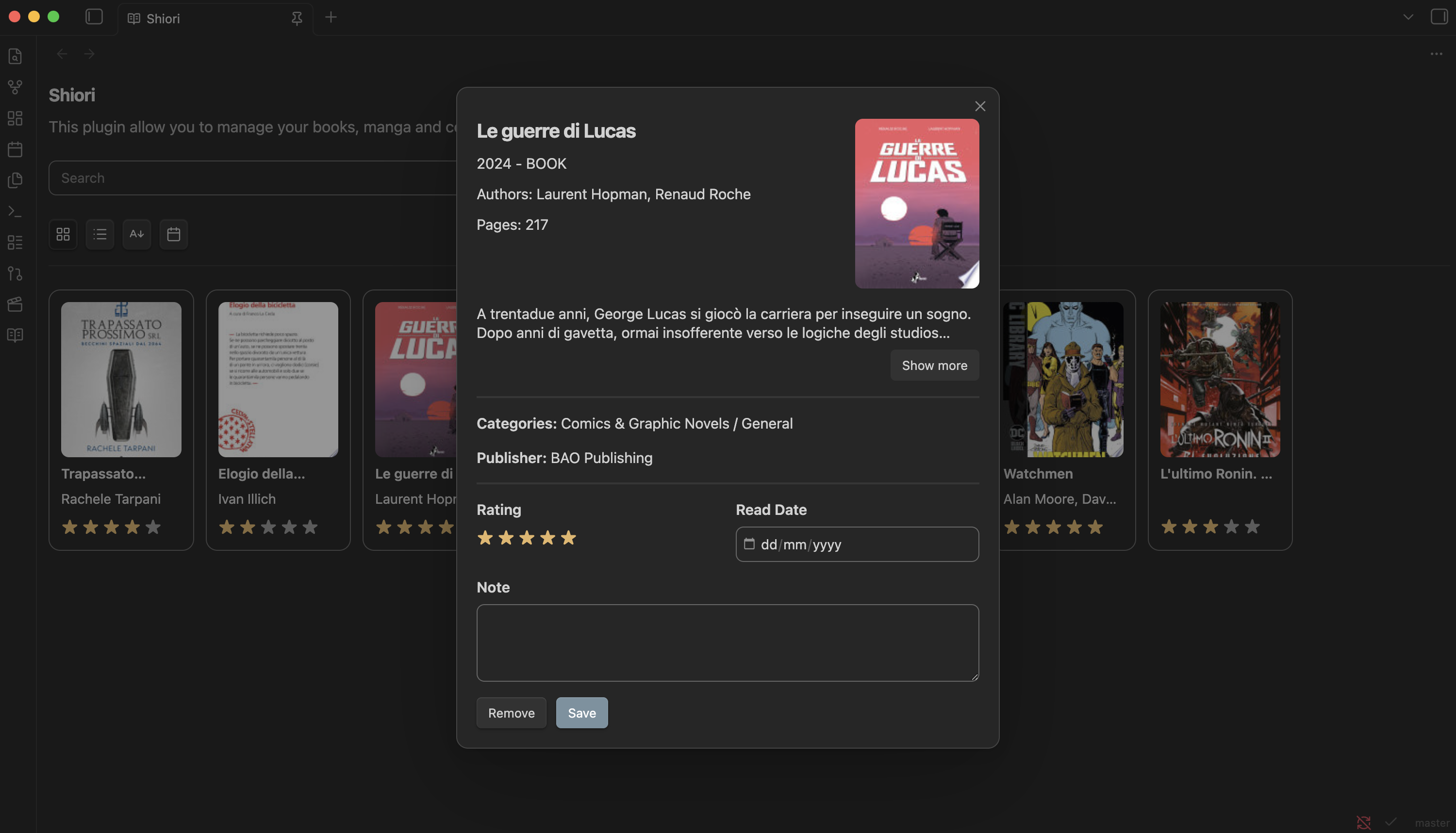 An Obsidian plugin to search, save, and manage your reading collection (books, manga, comics). It supports searches through external providers (e.g. Google Books), stores the library as a JSON file in the vault, and manages read status and ratings.