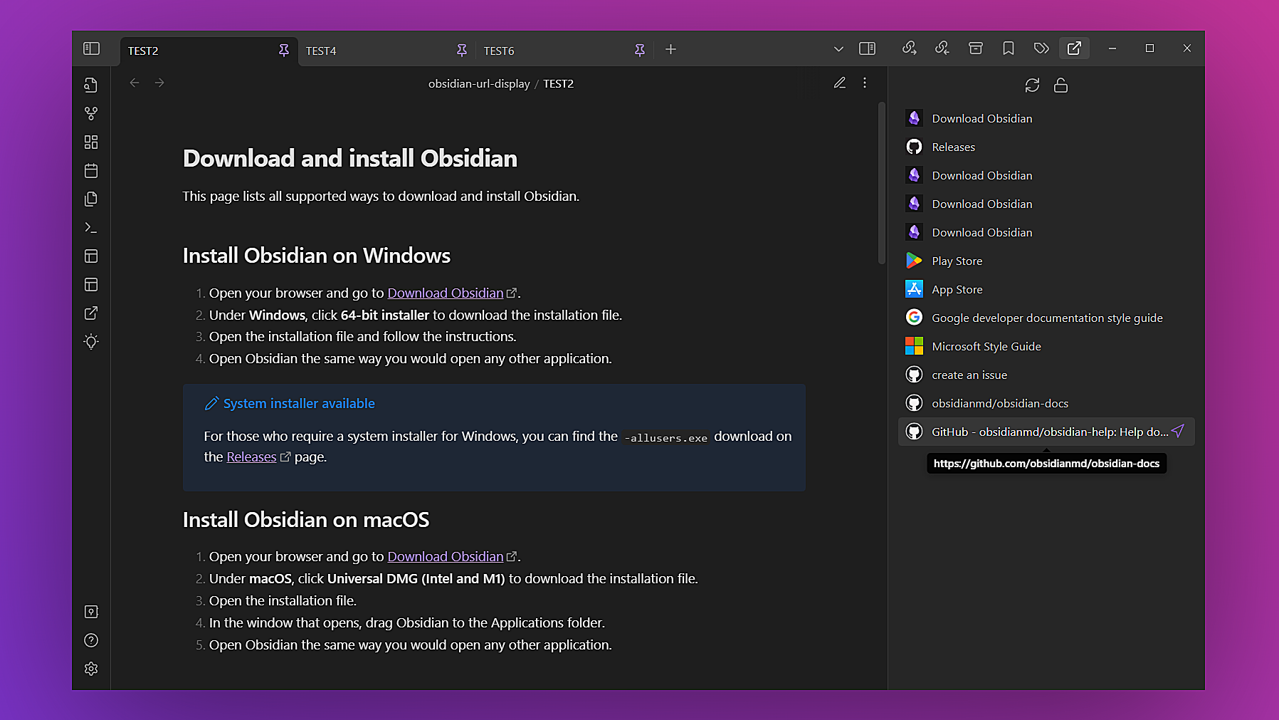 - Download the latest release. Extract and put 3 files (main.js, styles.css, manifest.json) to folder {{obsidian_vault}}/.obsidian/plugins/obsidian-url-display.