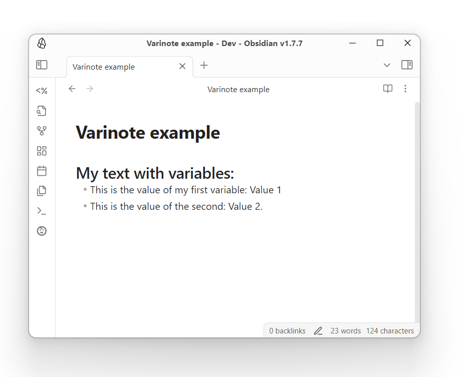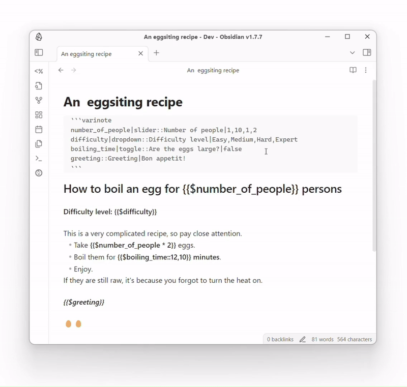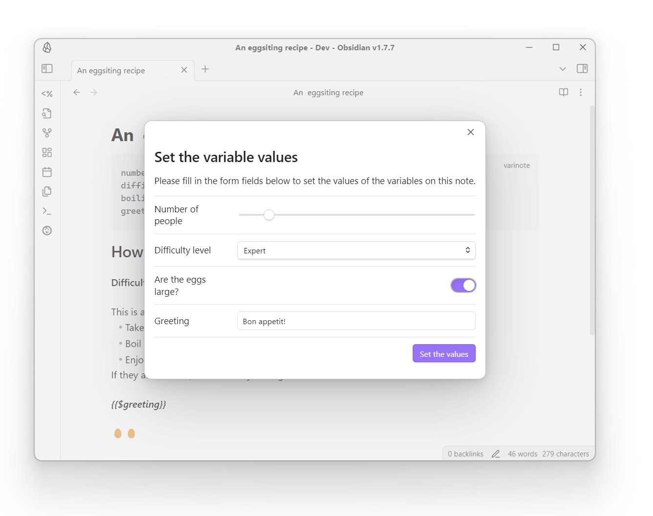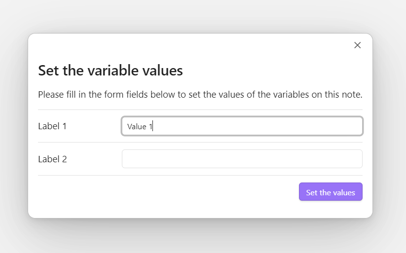 There, you can set the values for your variables or keep their defaults. Upon save, the Note will be updated. Don't worry, the block that sets the variables will not be carried over to the template, and your note will be clean, containing only the actual content that was intended to display:
