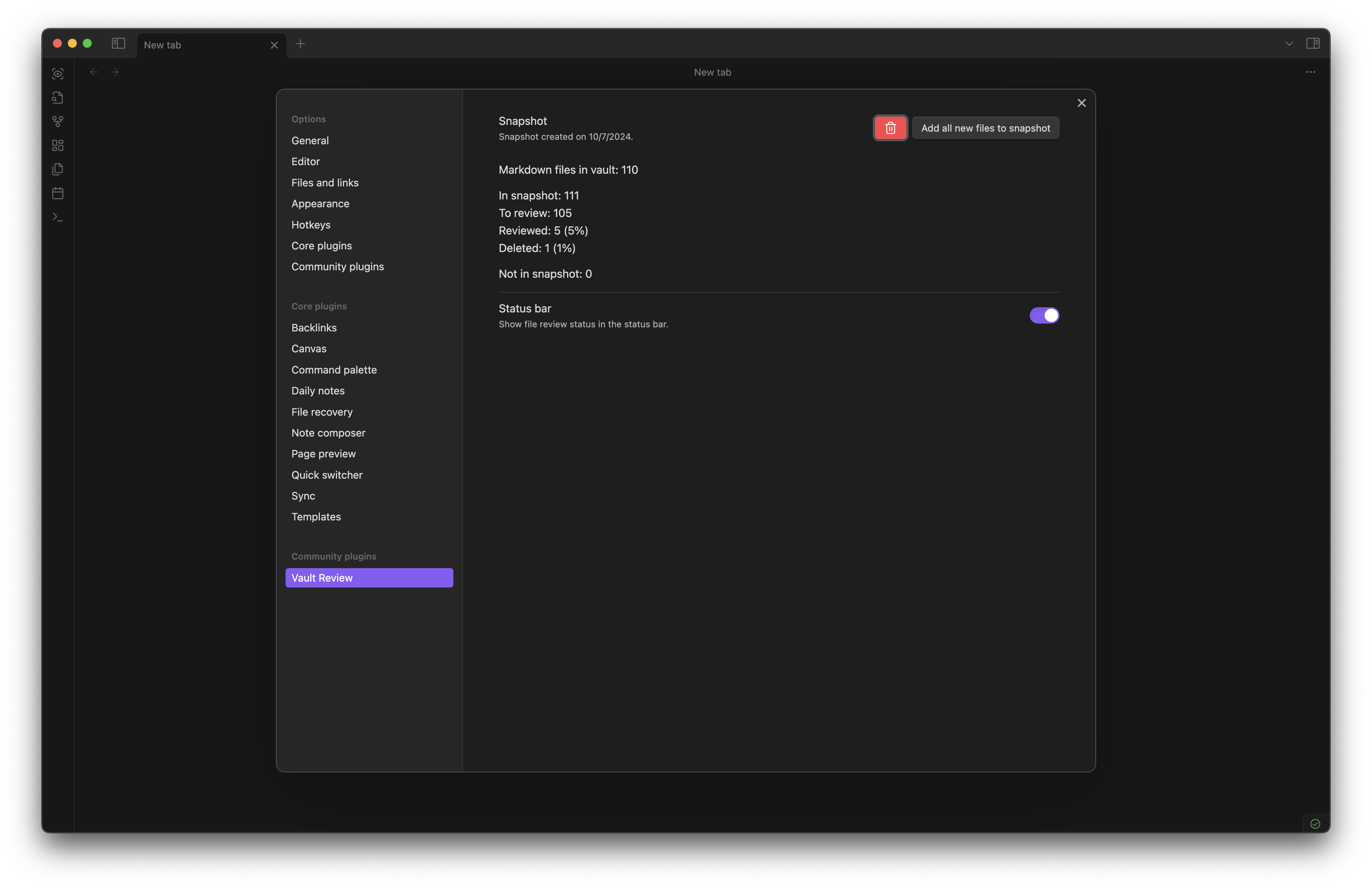 You have a lot of notes and you want to review/clear them. This plugin will create a snapshot of your vault (mark all existing notes as "to review") and then you can open them in random order and review (mark as "reviewed" or delete) one by one.