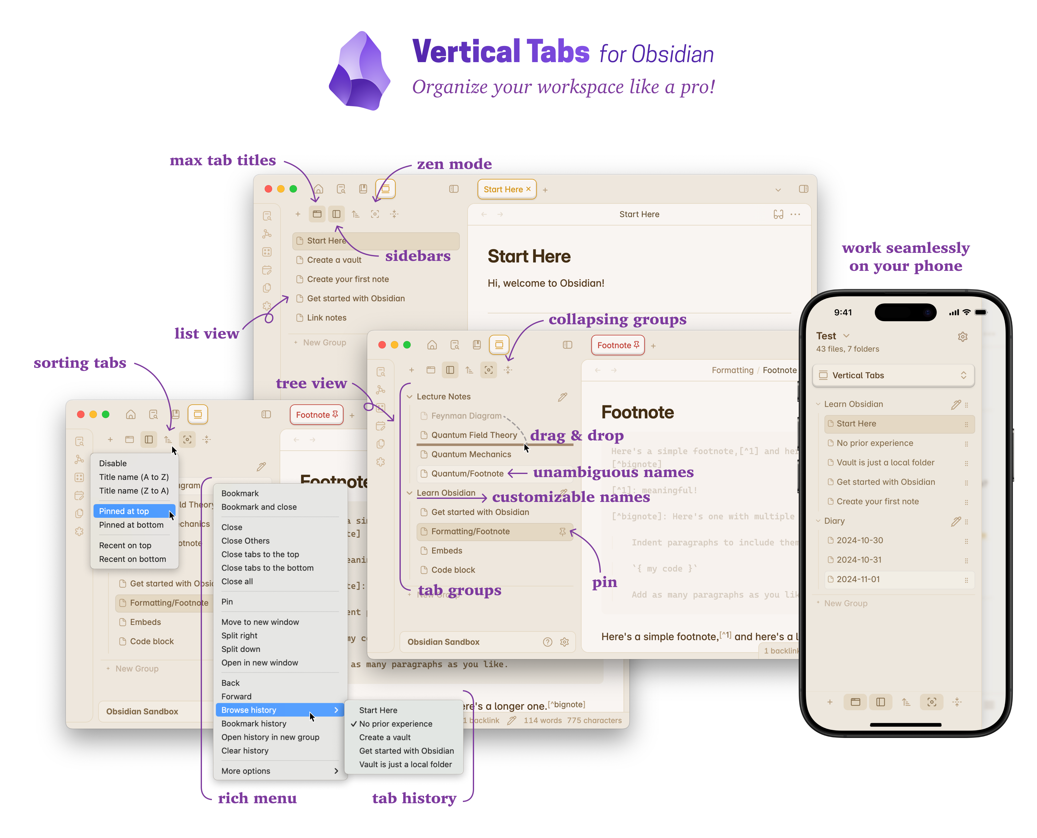 Productive users of Obsidian often find themselves juggling a large number of open notes, and the default horizontal tab layout can make it challenging to locate and switch between them. As more notes are opened, tabs become narrower, making titles harder to read. This can lead to decreased productivity and increased frustration.