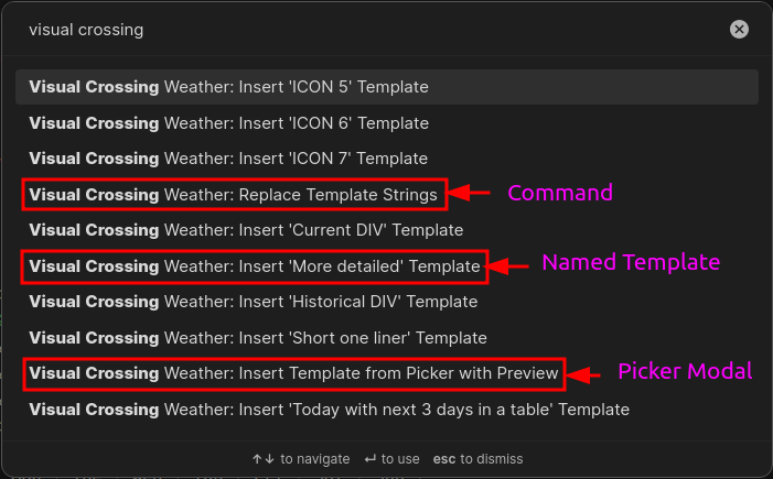 Visual Crossing Weather: Replace template strings- This will replace all occurences of the weather template strings,%weather1%to%weather8%with the corresponding defined weather templates data. This should normally not be required as the plugin should automatically do this for you. This command is available in case you wish to do the replacements in an excluded folder.