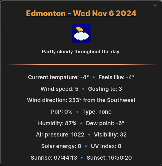 - Clicking on the weather data in the statusbar will open a modal with detailed info on todays weather
