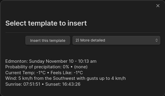 Visual Crossing Weather: Insert template from Picker with Preview- Displays a modal allowing you see a preveiw of the selected template before insertion-