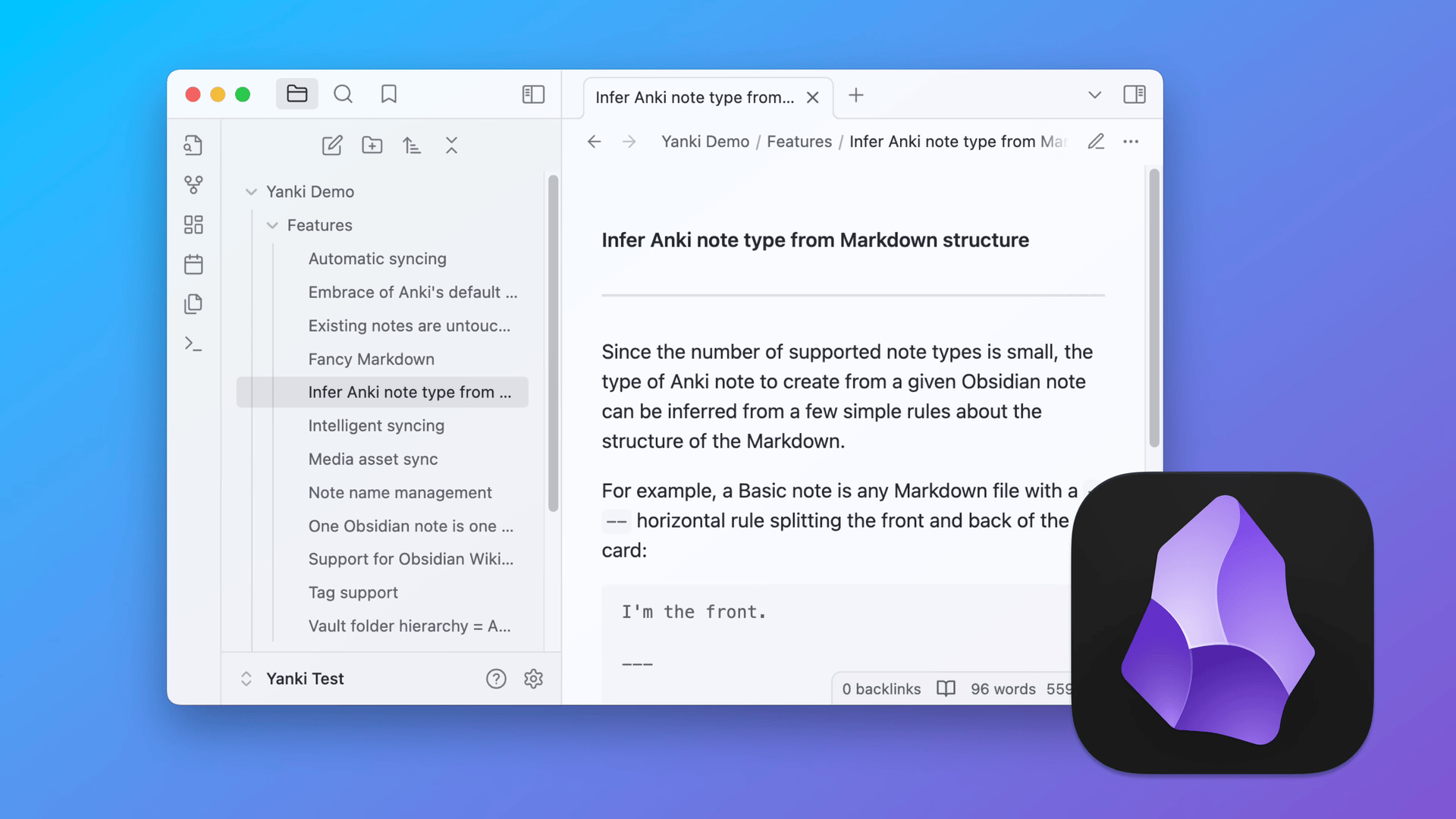 The structure of the Markdown in your Obsidian notes determines the types of Anki notes they become. No extra syntax or Anki-specific markup is required — just pure Markdown.