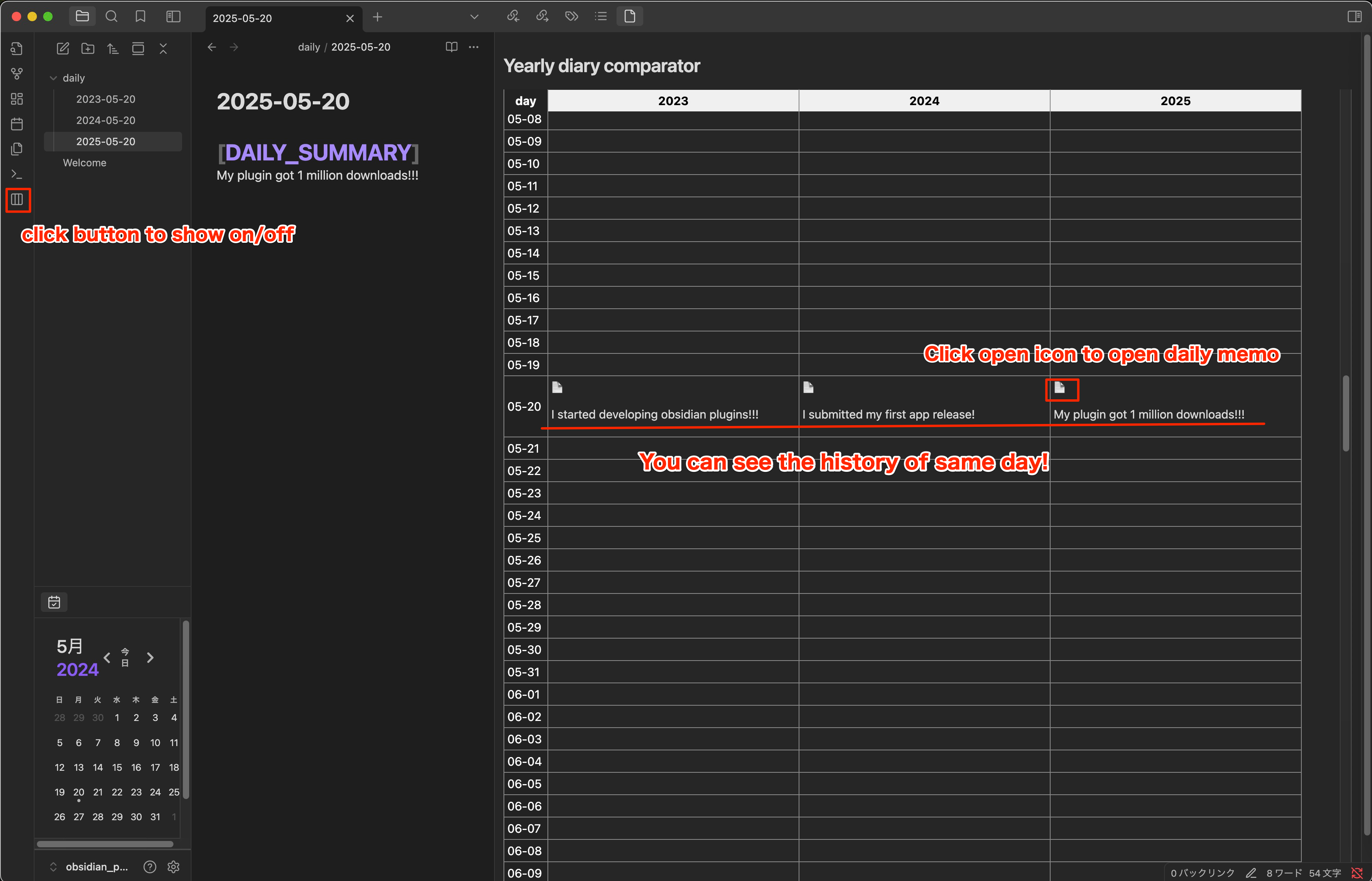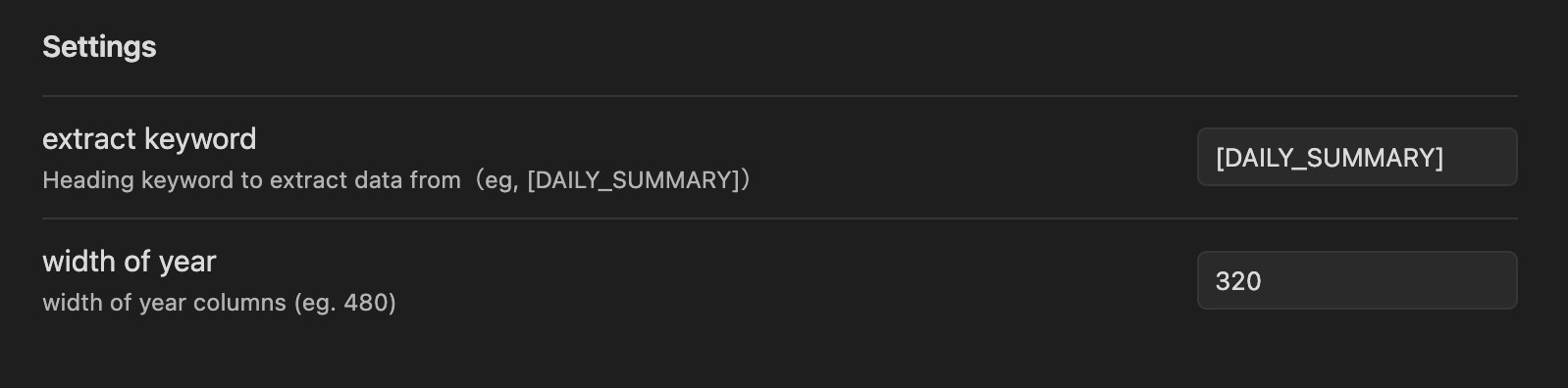 This plugin provides a yearly calendar view for Obsidian daily notes, allowing you to compare your activities or diary entries across different years. By displaying entries for the same date side by side, you can intuitively review changes and track your personal growth year over year.