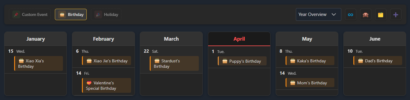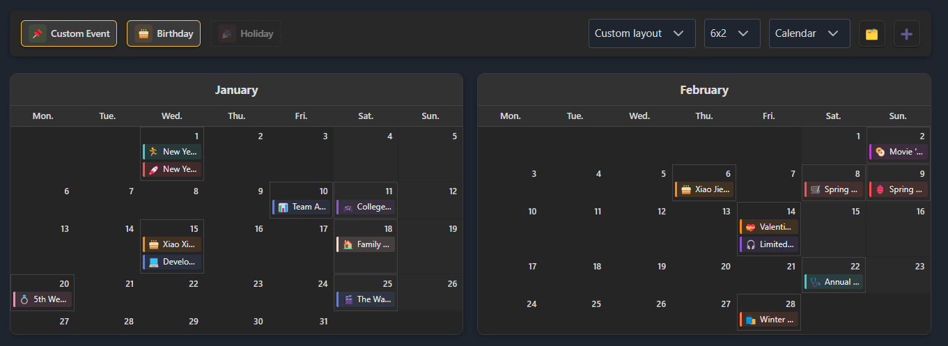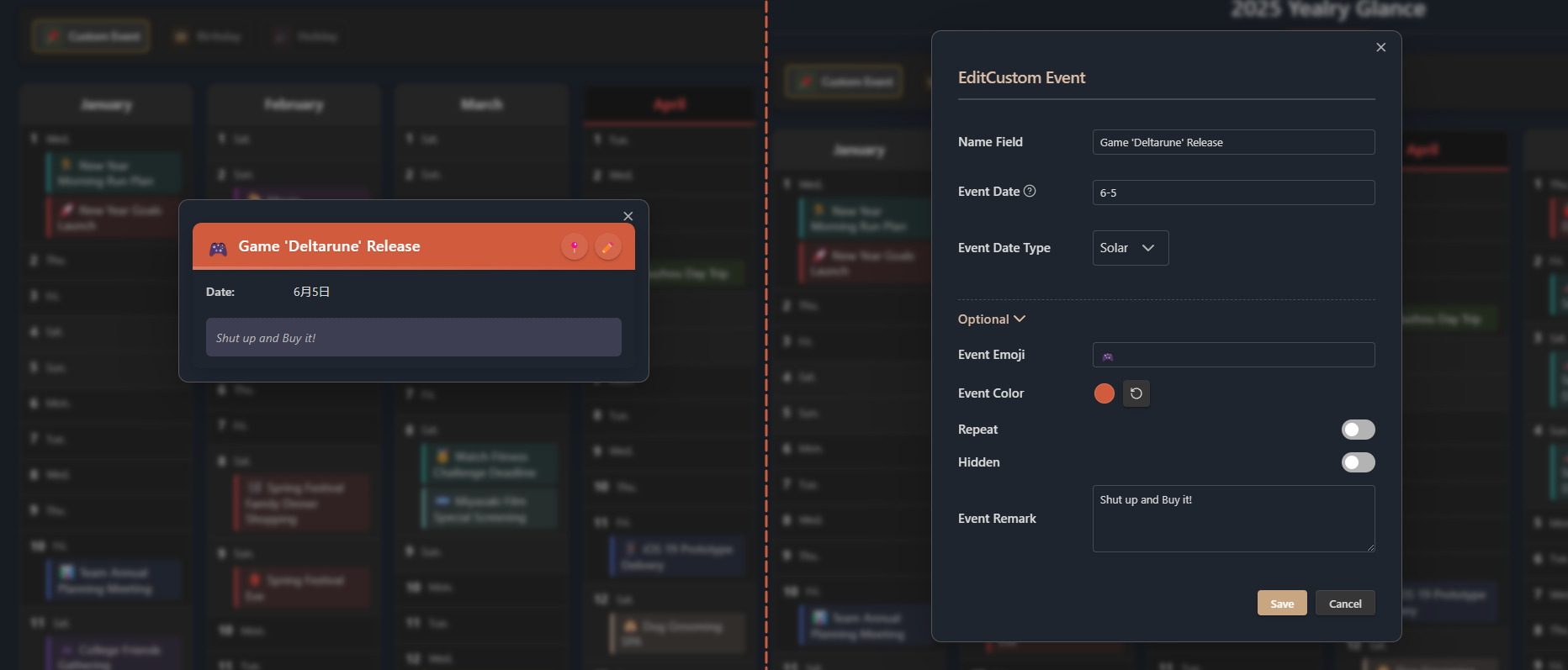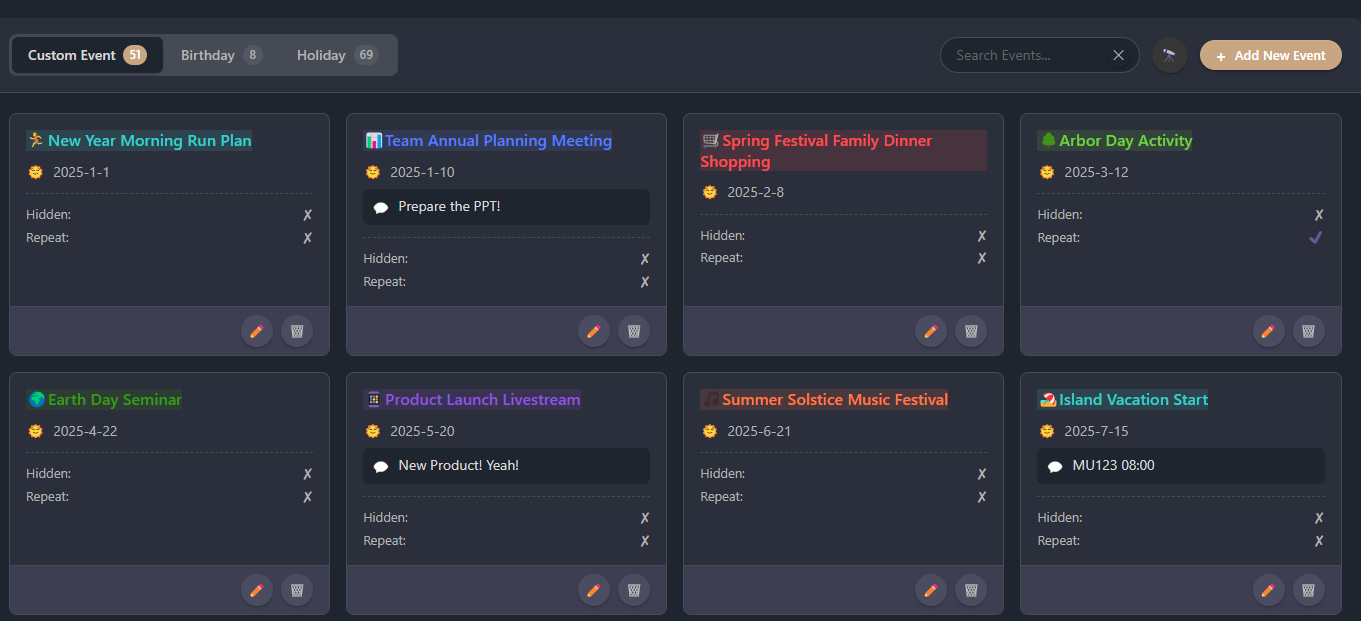 - 🎉 Multiple Event Types: Supports holidays, birthdays, and fully customizable events.