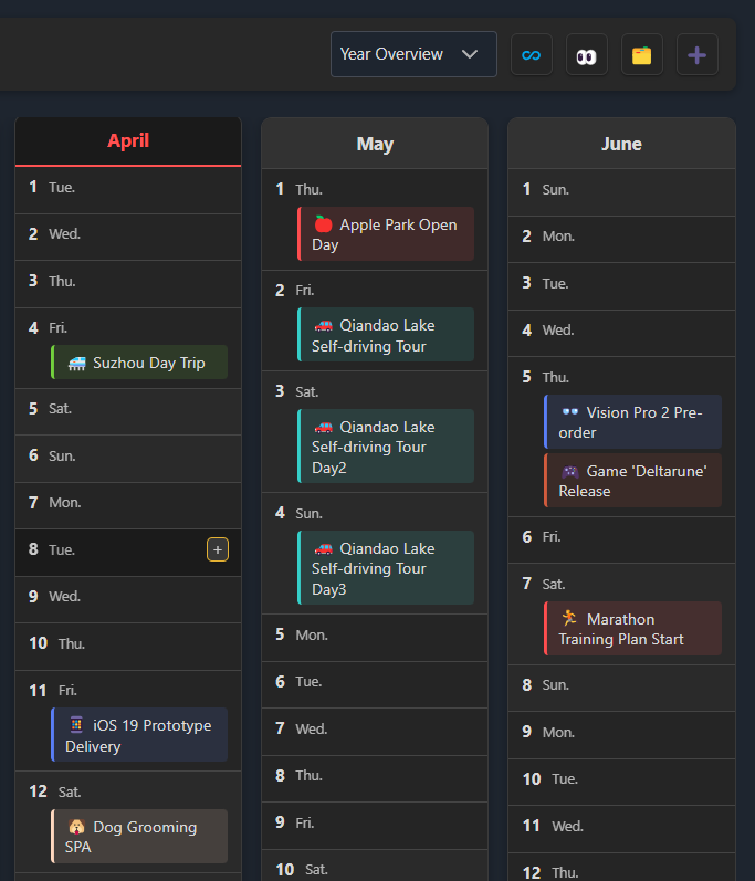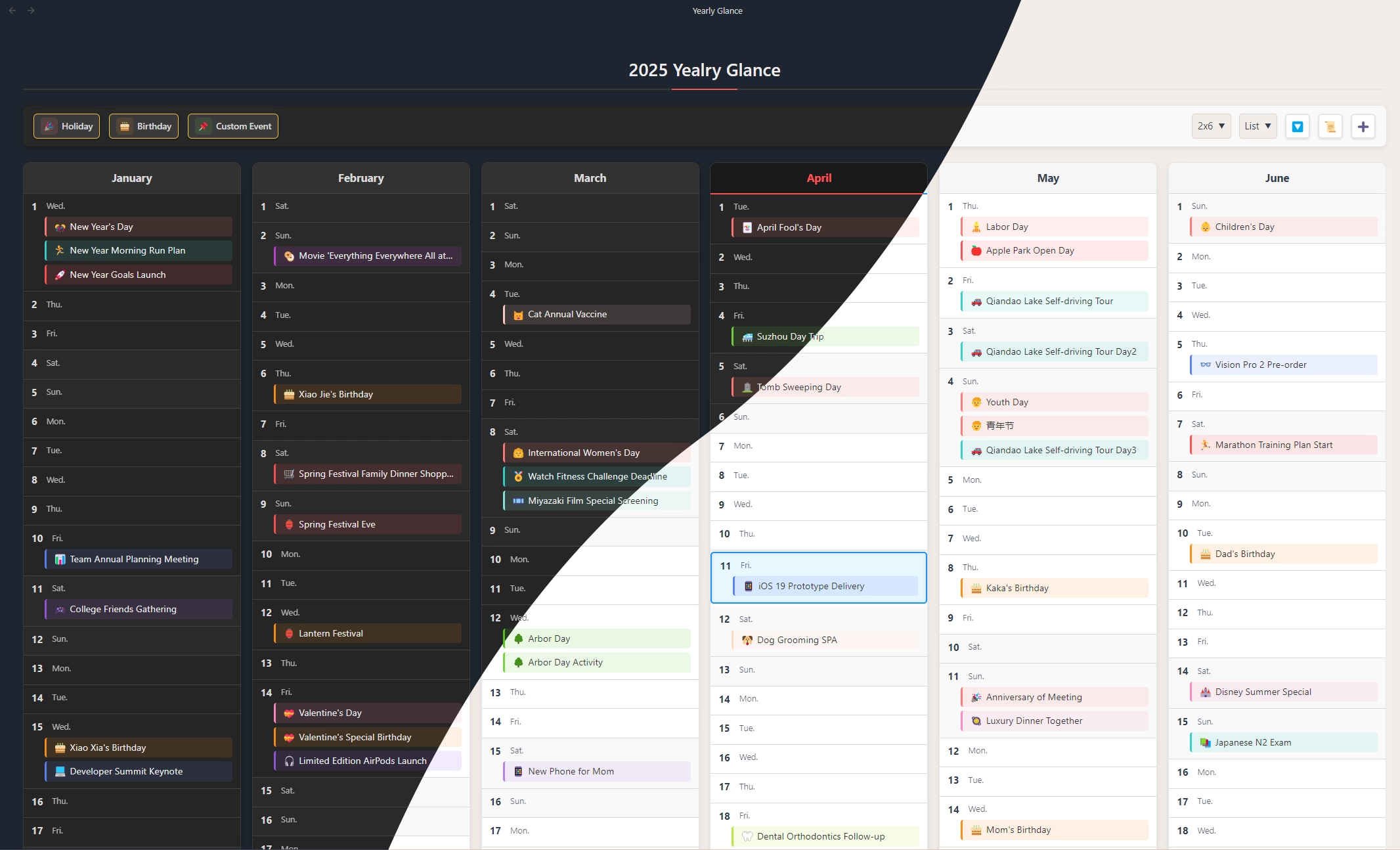 Yearly Glance is an Obsidian plugin that provides a visual and customizable overview of annual events, helping you efficiently plan, review, and manage important dates throughout the year.