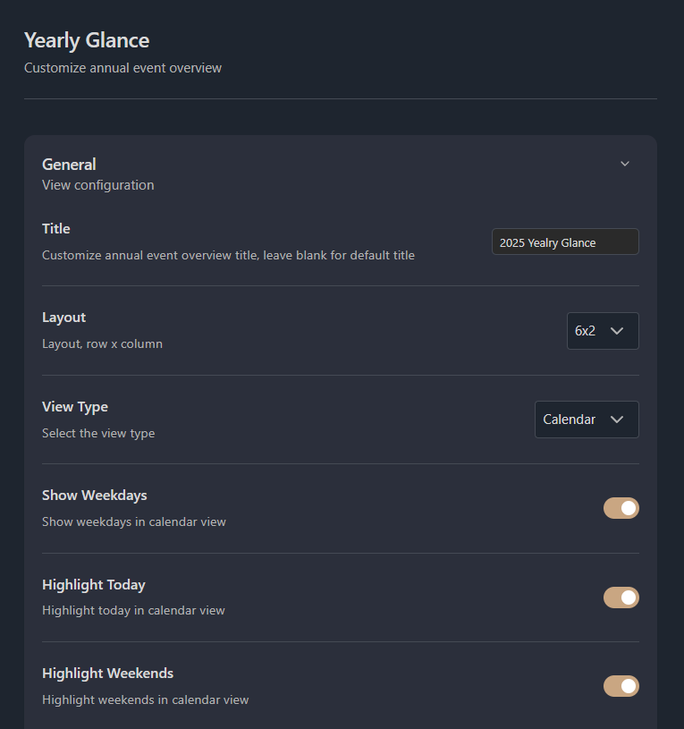 - Switch between Yearly Overview (recommended), Classic Calendar, or Custom View