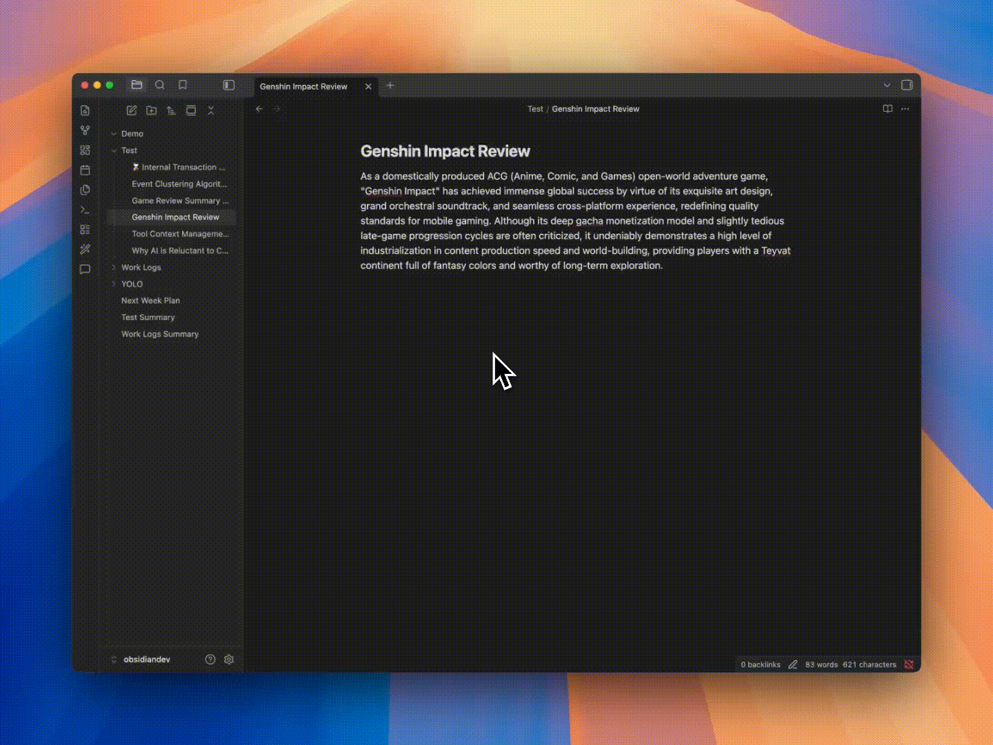 | Turn your entire Vault into the AI's knowledge base, powered by RAG to answer with context from your notes instead of generic output | Summon anywhere to freely continue your creative flow with smooth content generation |